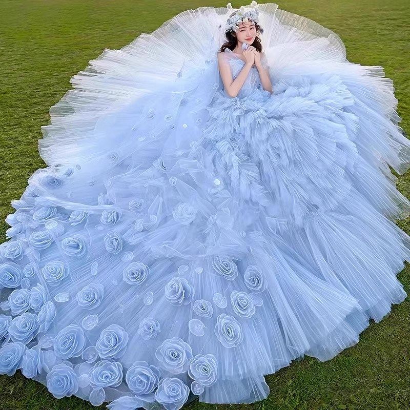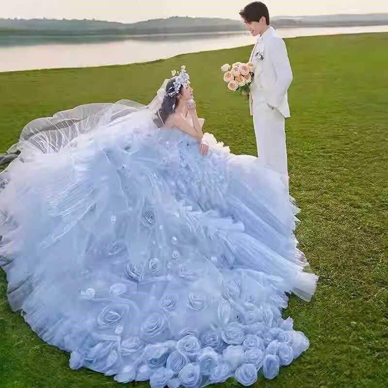法式 轻奢高级感轻婚纱立体花朵缎面礼服显瘦气质新娘订婚结婚长裙