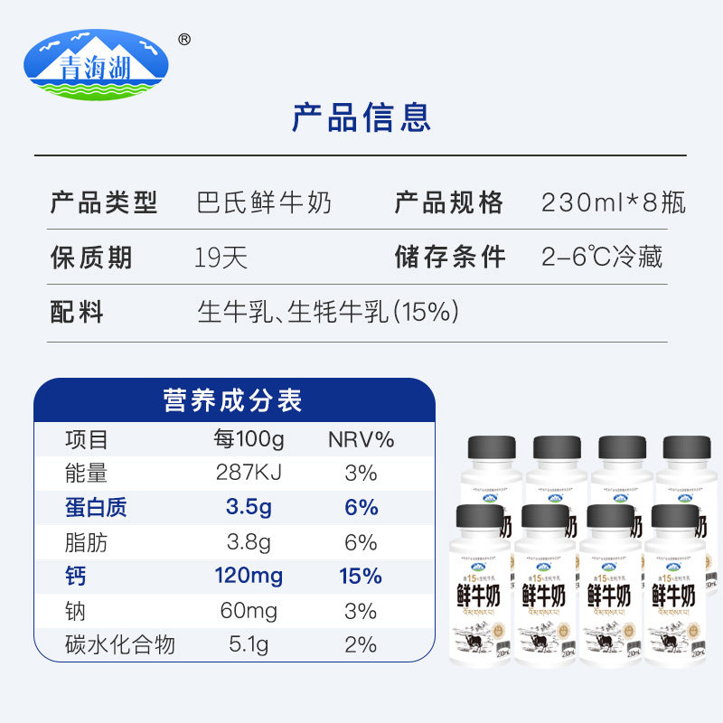 青海湖高原鲜牛奶含15%牦牛鲜奶组合装 8瓶儿童早餐低温牛奶 230ml