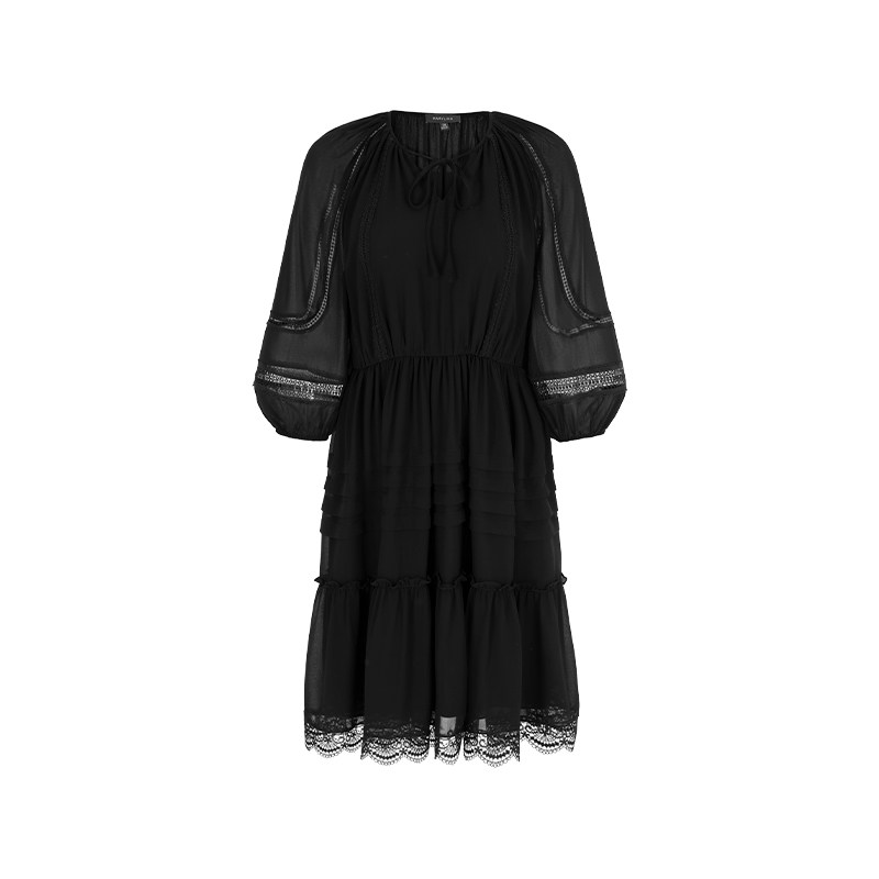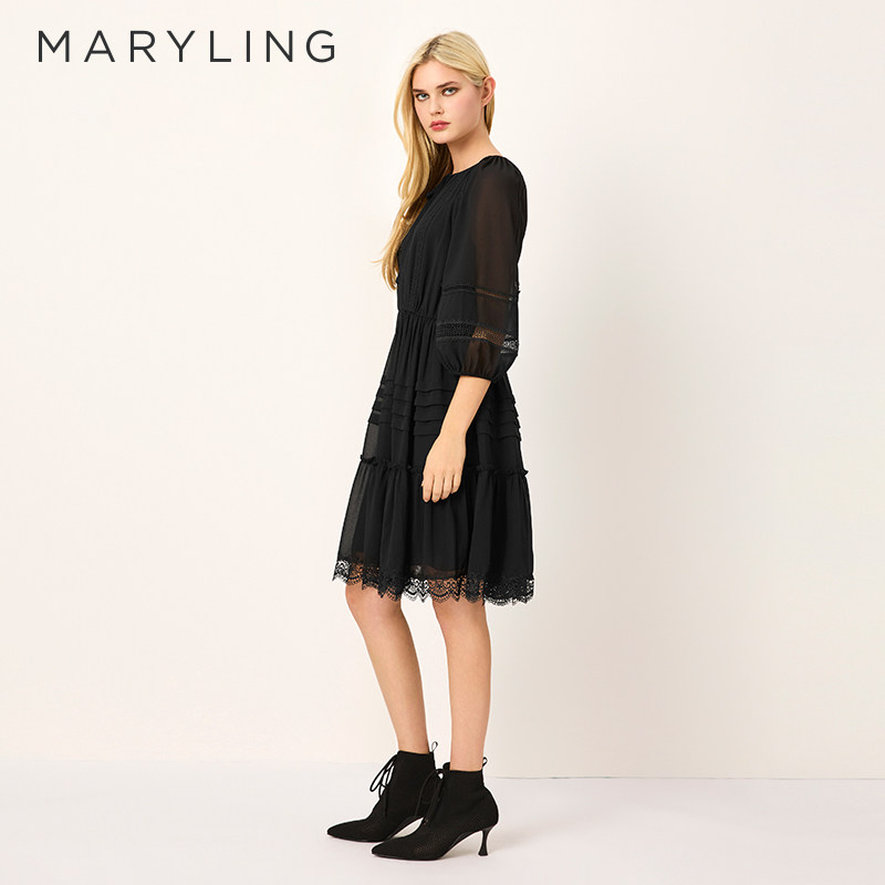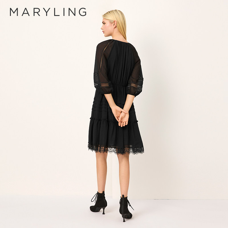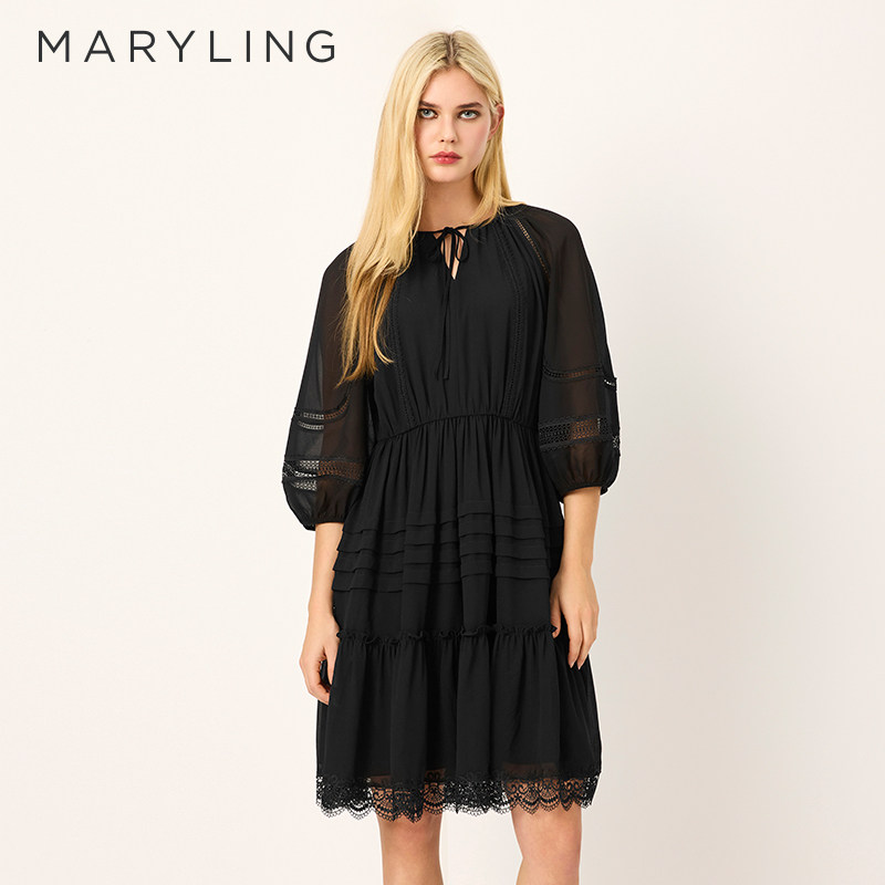 V领蕾丝花边连衣裙A1FCW63340 灯笼袖 MARYLING玛俪琳2025夏季 新品
