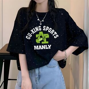 oversize小众设计感潮牌宽松上衣 T恤女生夏季 美式 黑色满天星短袖