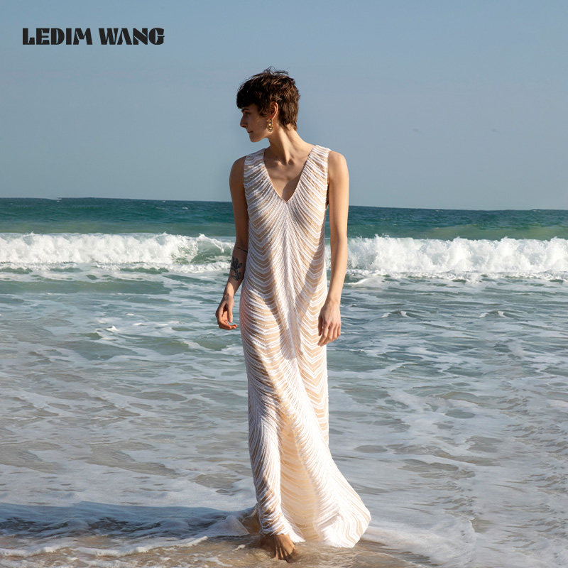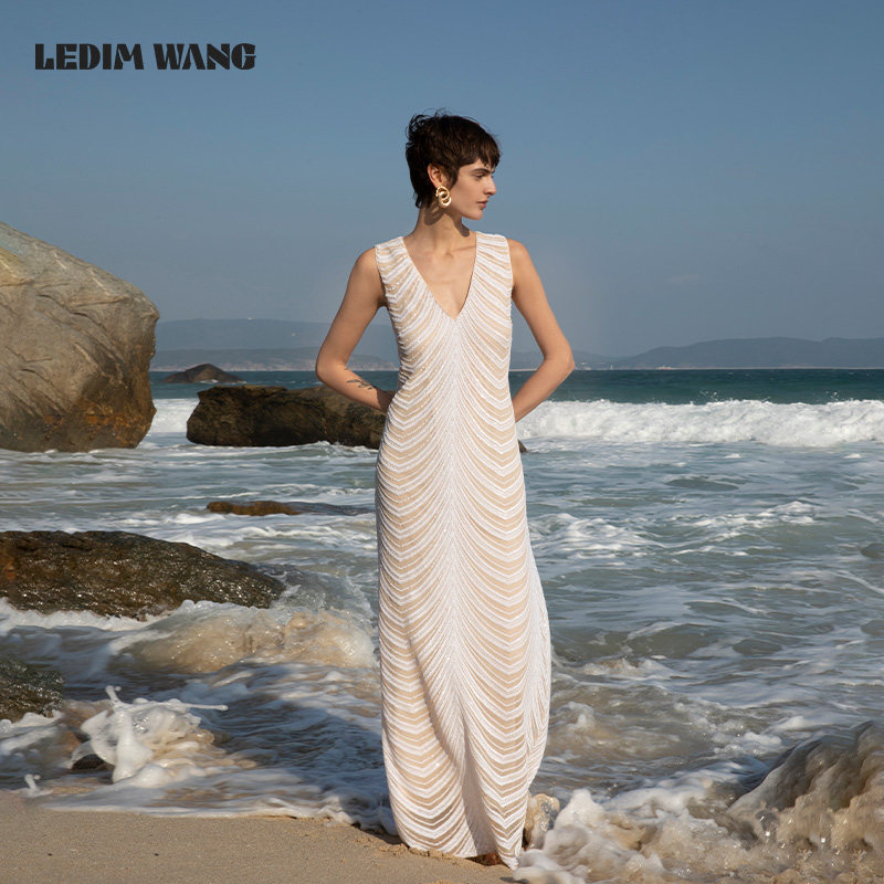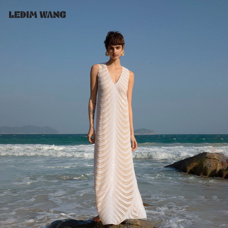 LEDIM 亮片白色连衣裙女度假风新年战袍年会小众内搭长裙 WANG法式