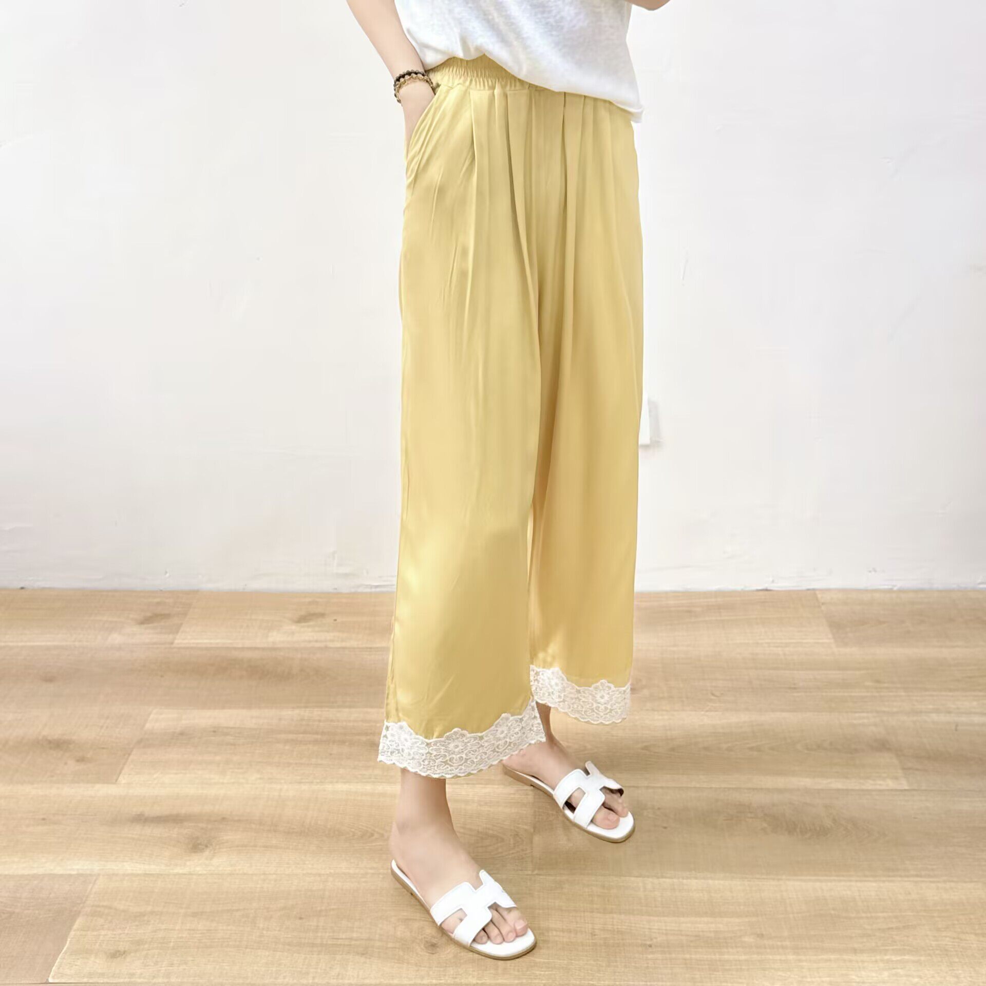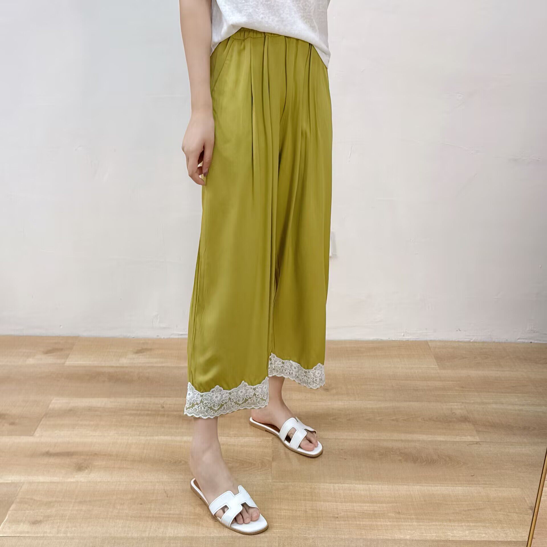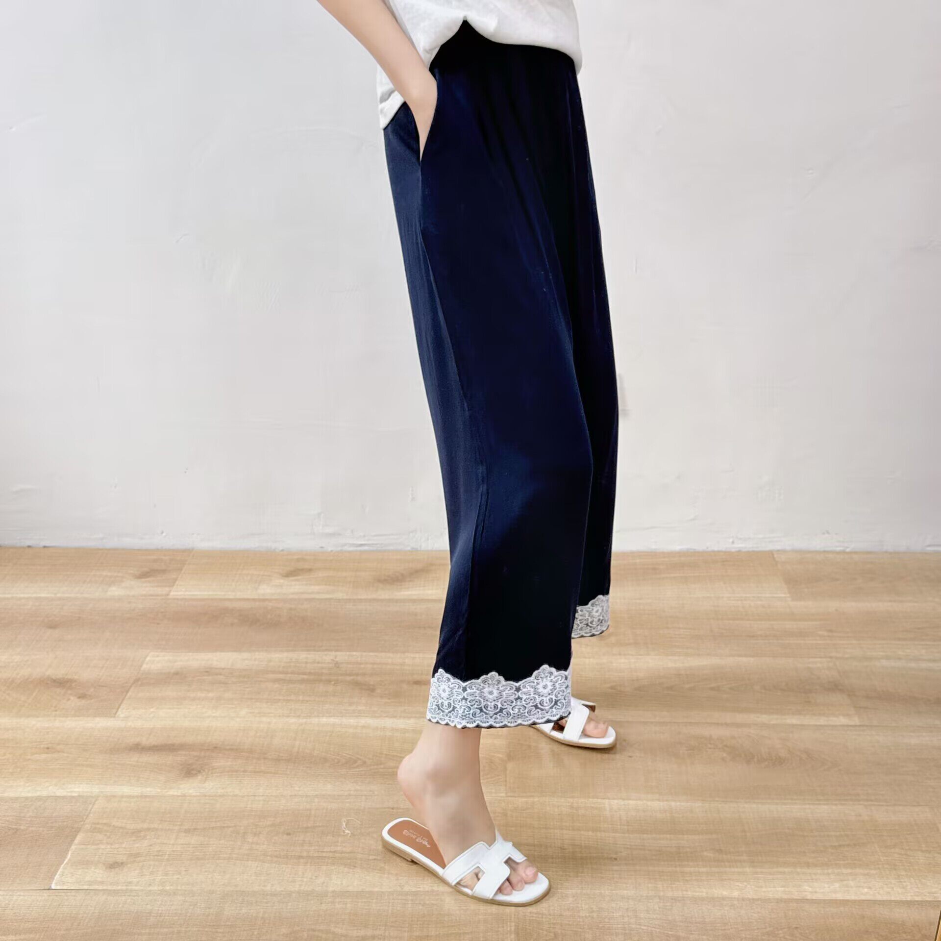 薄款 女夏季 宽松显瘦蕾丝花边垂感 棉绸九分阔腿裤 人造棉休闲直筒裤