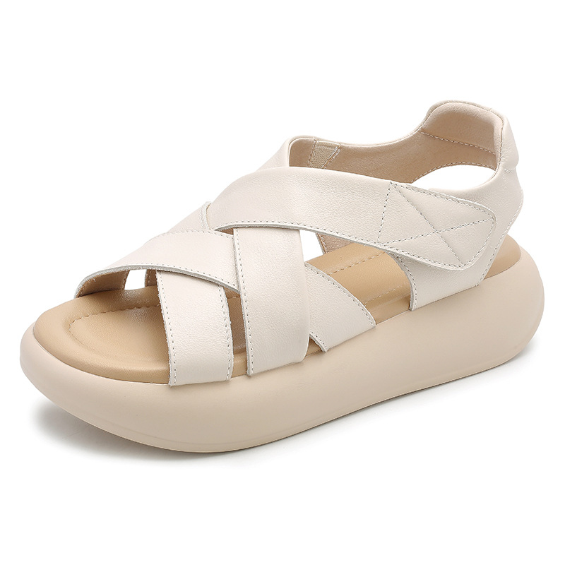 时尚 新款 百搭软底舒适镂空松糕底 女2025夏季 厚底绑带真皮凉鞋