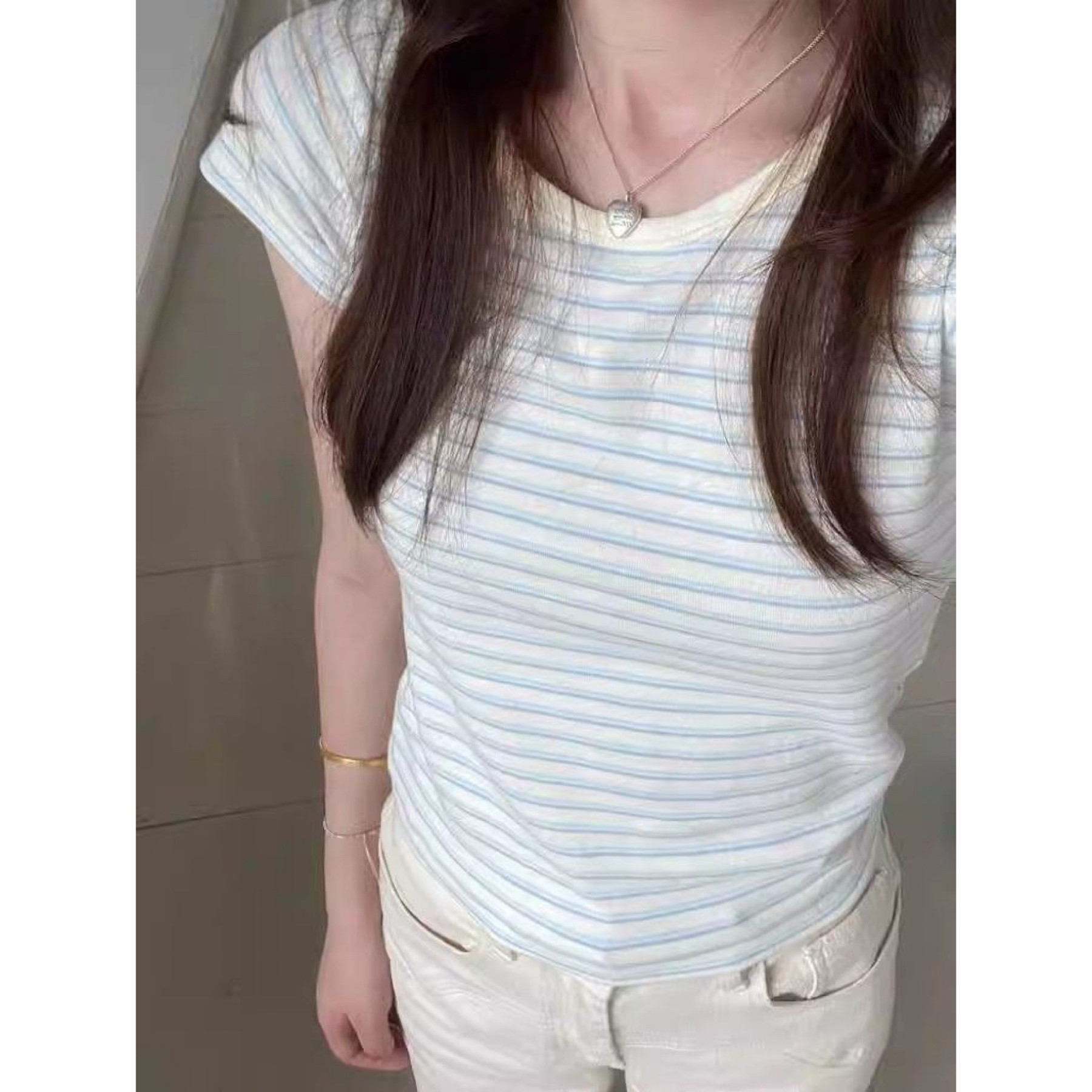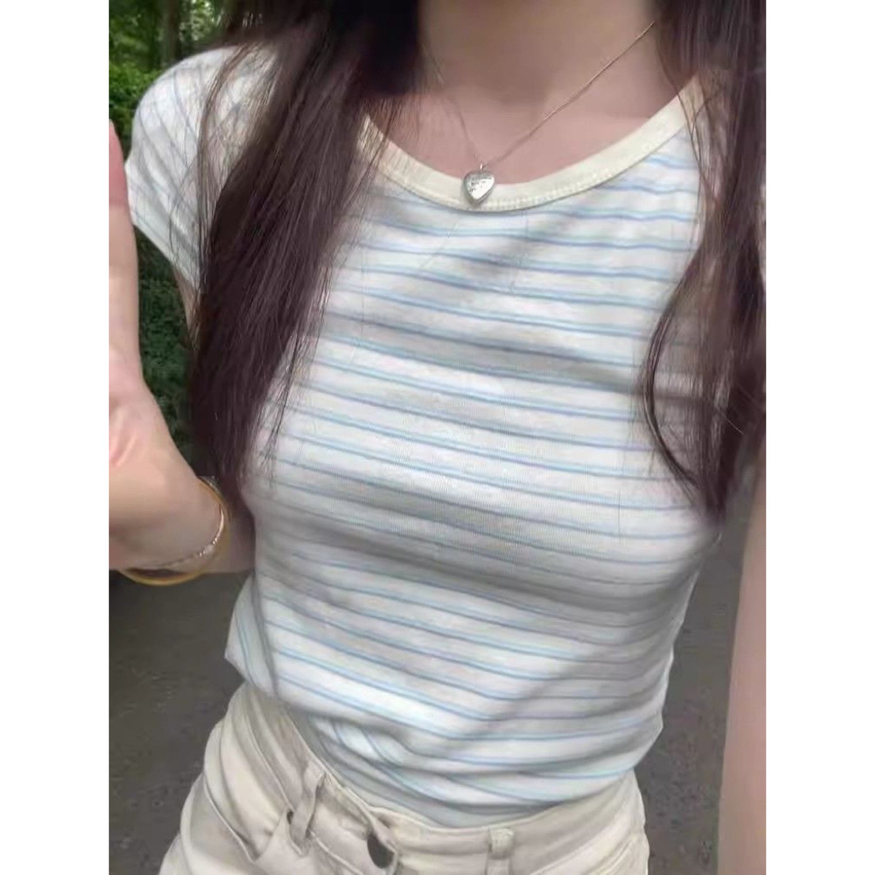 新款 上衣短袖 港风正肩短袖 蓝白条纹短款 女 T恤女修身 2026夏季