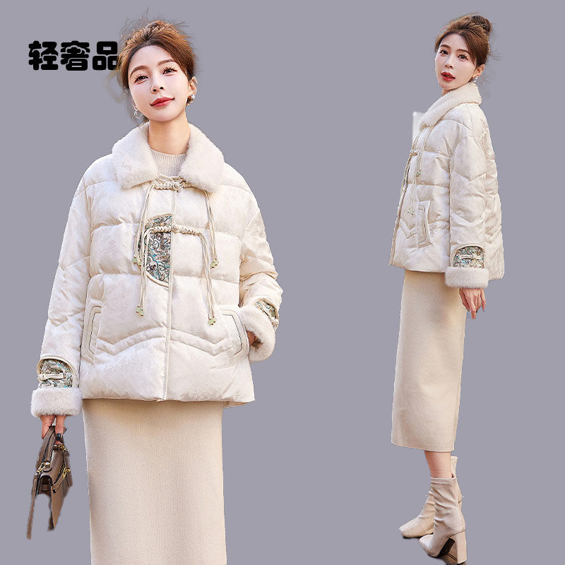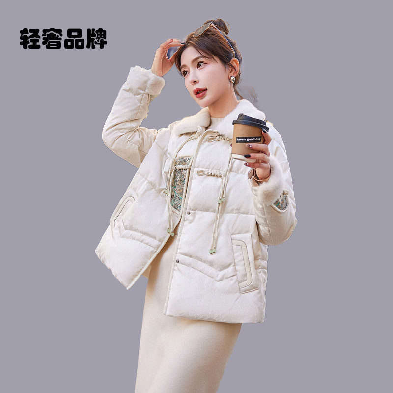 朗姿约定新中式 翻领复古盘扣高级感白鸭绒外套 国风羽绒服女冬季