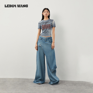 WANG搭片垂感牛仔裤 LEDIM 女设计感宽松显瘦阔腿长裤 明星同款