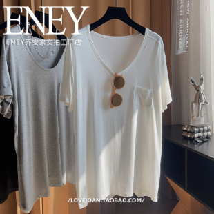 垂感十足 上衣潮中长 大圆领莫代尔T恤女夏露锁骨宽松显瘦口袋短袖