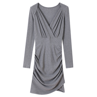 显瘦包臀裙子 低胸V领褶皱遮肚子收腰修身 性感连衣裙春装 夜店女装