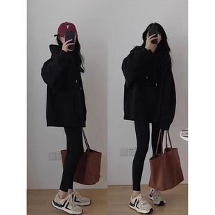 宽松中长款 100%纯棉黑色连帽春秋薄款 时尚 爆款 外套 卫衣女秋冬新款