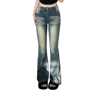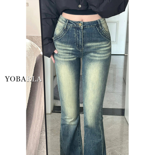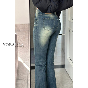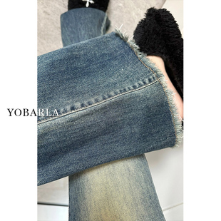 胖mm弹力显瘦梨形身材毛边裤 高腰大码 子 女秋季 复古蓝微喇叭牛仔裤
