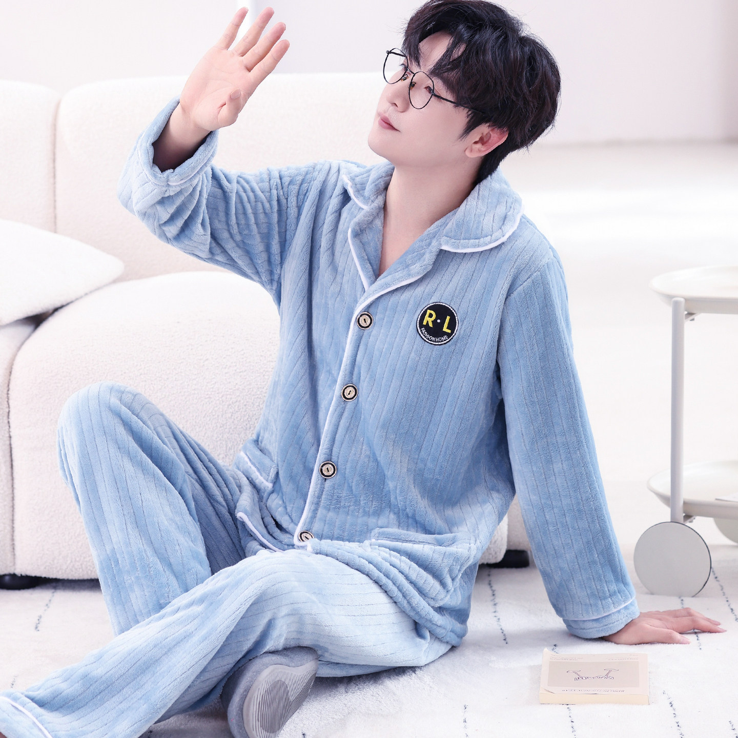 青少年家居服套装 珊瑚绒三层夹棉加厚加绒睡袍长款 睡衣秋冬季 男士
