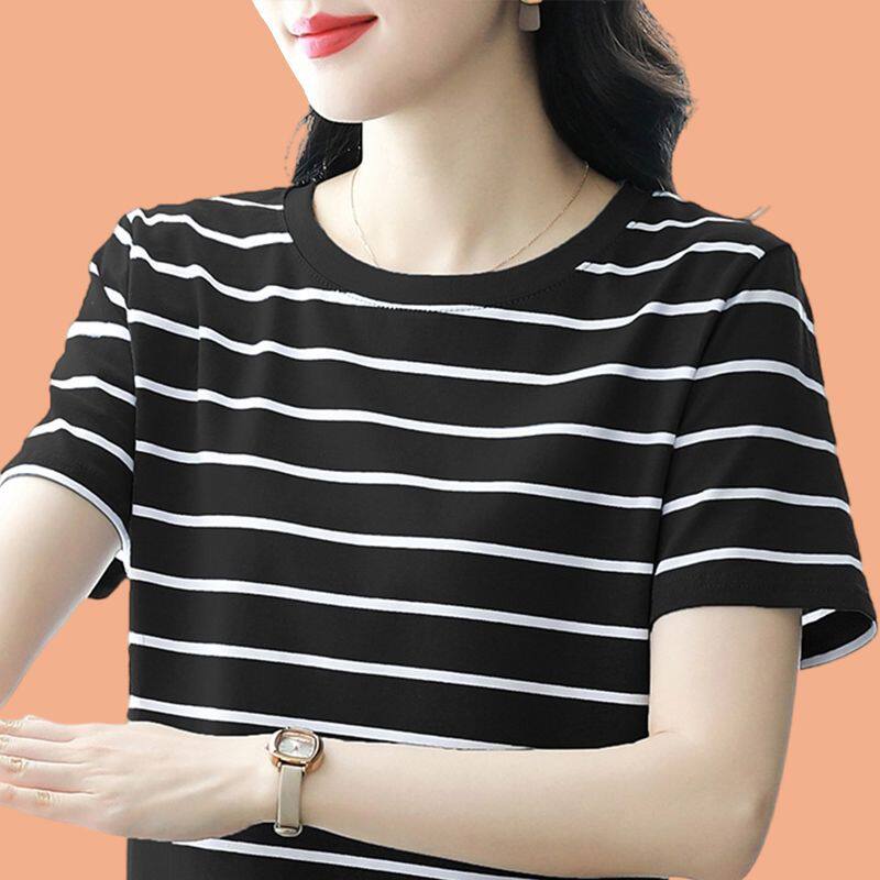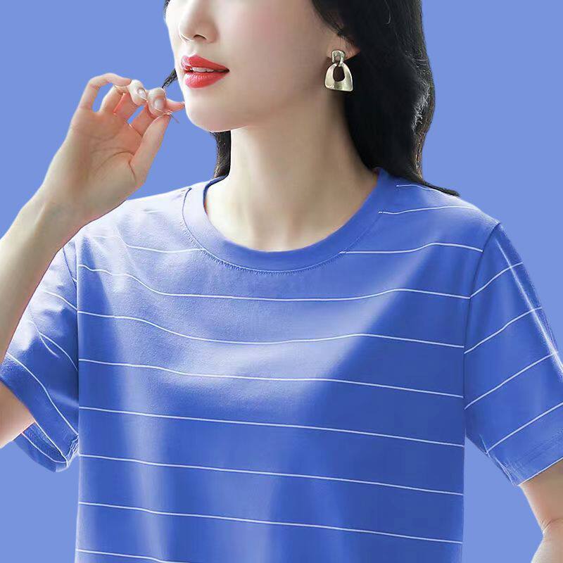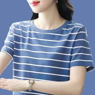 宽松胖mm大码 夏装 纯棉妈妈遮肚子洋气上衣 T恤女2026新款 条纹短袖
