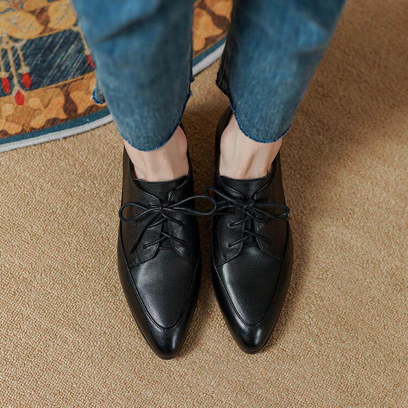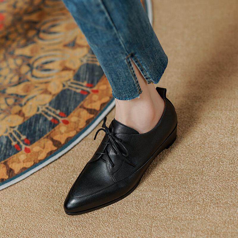 厚底尖头女棕色单鞋 2022春季 坡跟系带软底妈妈鞋 内增高单皮鞋 新款