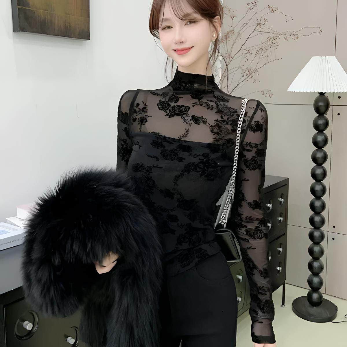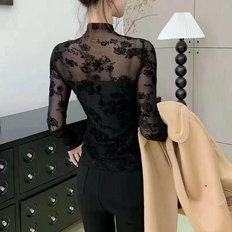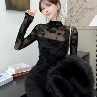 网红洋气时尚 加绒打底植绒上衣显瘦长袖 性感 半高领蕾丝衫 轻熟法式