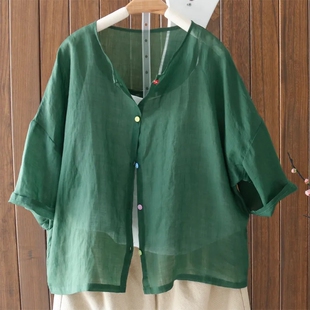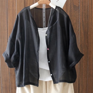 外搭夏季 复古文艺百搭五分袖 薄款 圆领宽松大码 小衫 时尚 衬衫 女 开衫