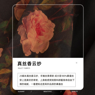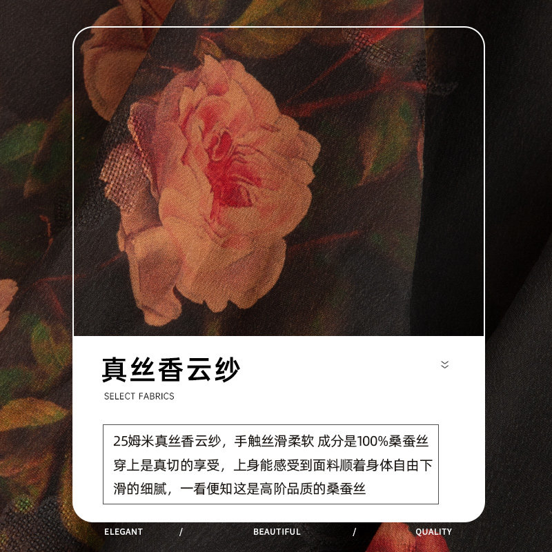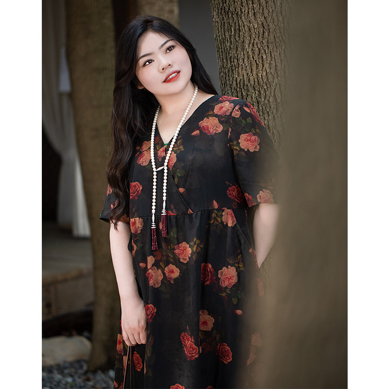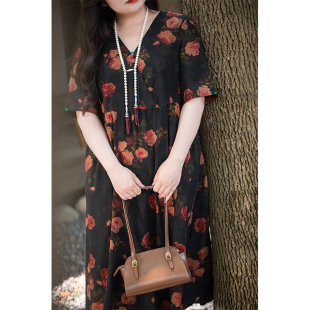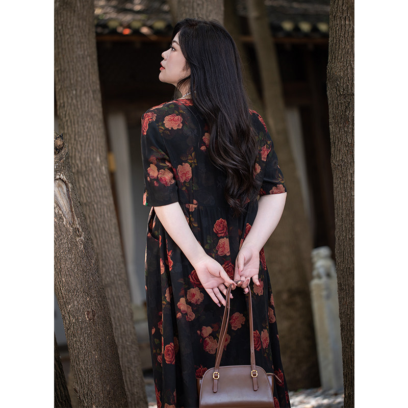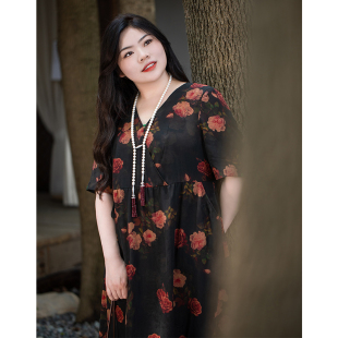 高级感复古连衣裙 女装 美丽客栈玫瑰庄园 连衣裙夏真丝V领显瘦大码