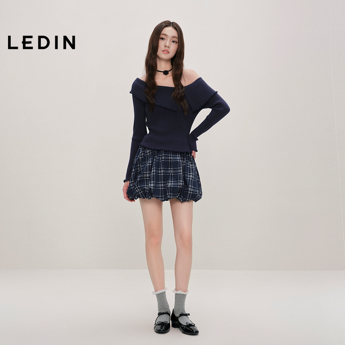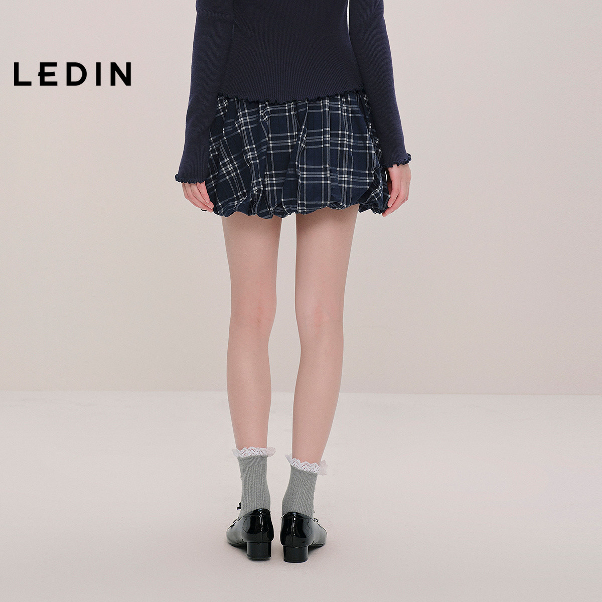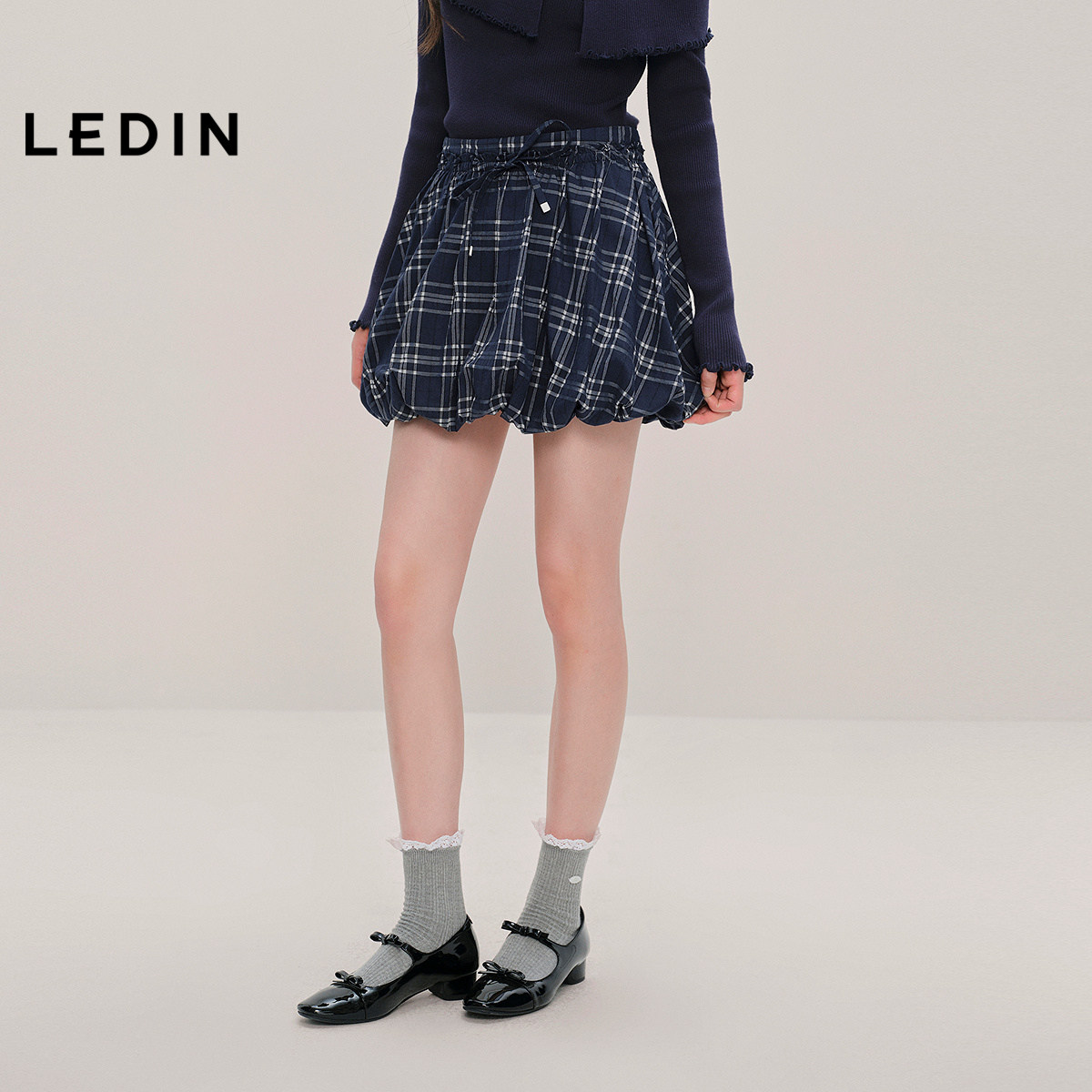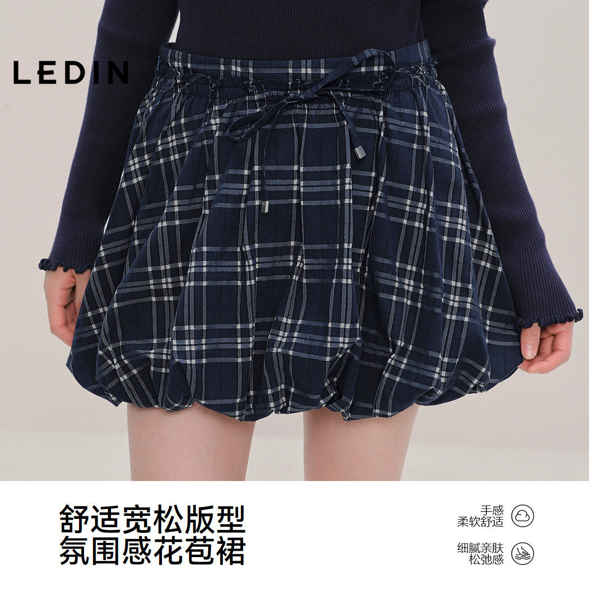 饰半身裙秋款 乐町抽绳装 设计感格纹花苞裙C1GEF3408 商场同款