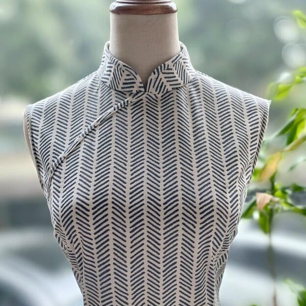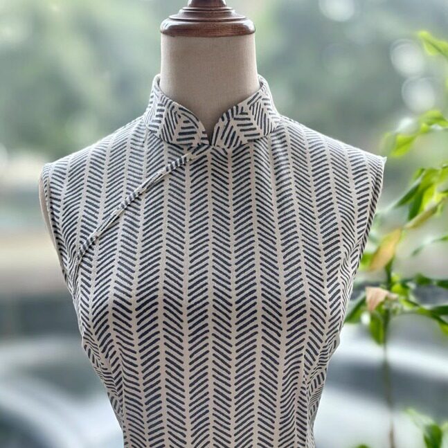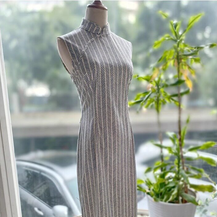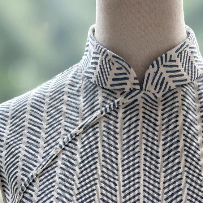 JULEE定制灯芯绒人字纹简笔印花旗袍 日常复古长裙