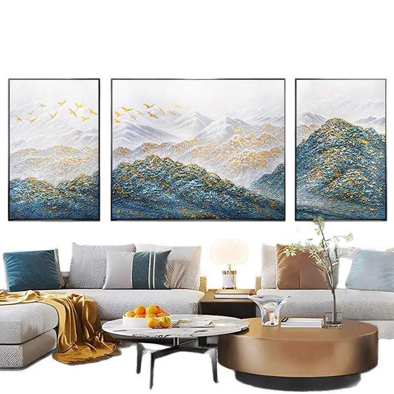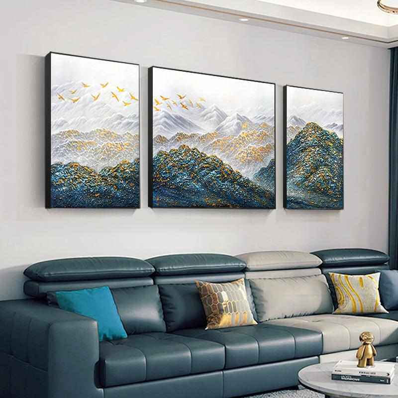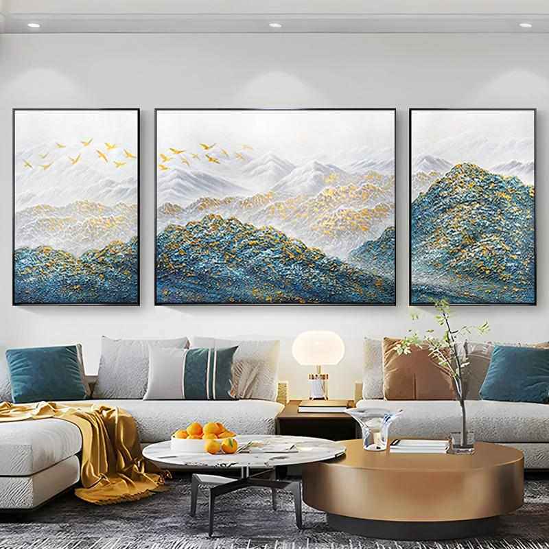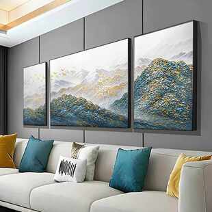 孔雀蓝金山三联画纯手绘油画客厅装 饰画沙发背景墙挂画大芬村