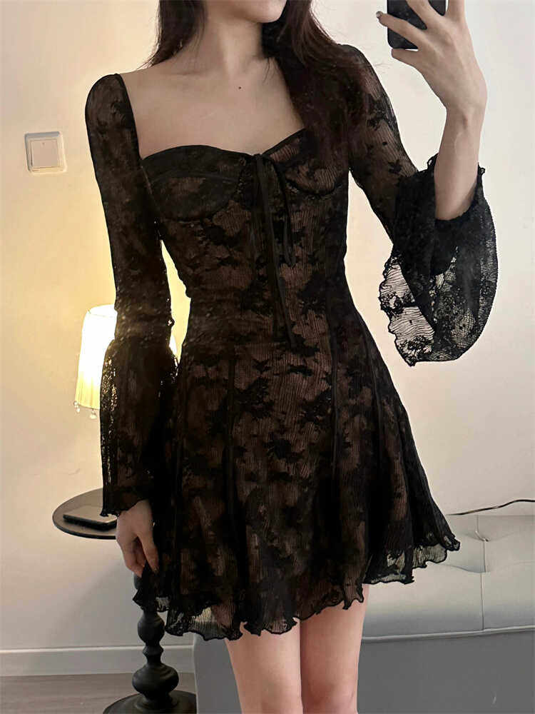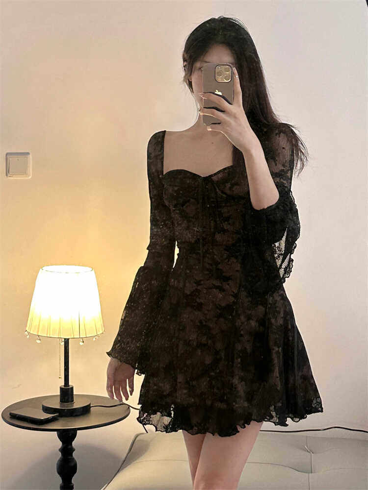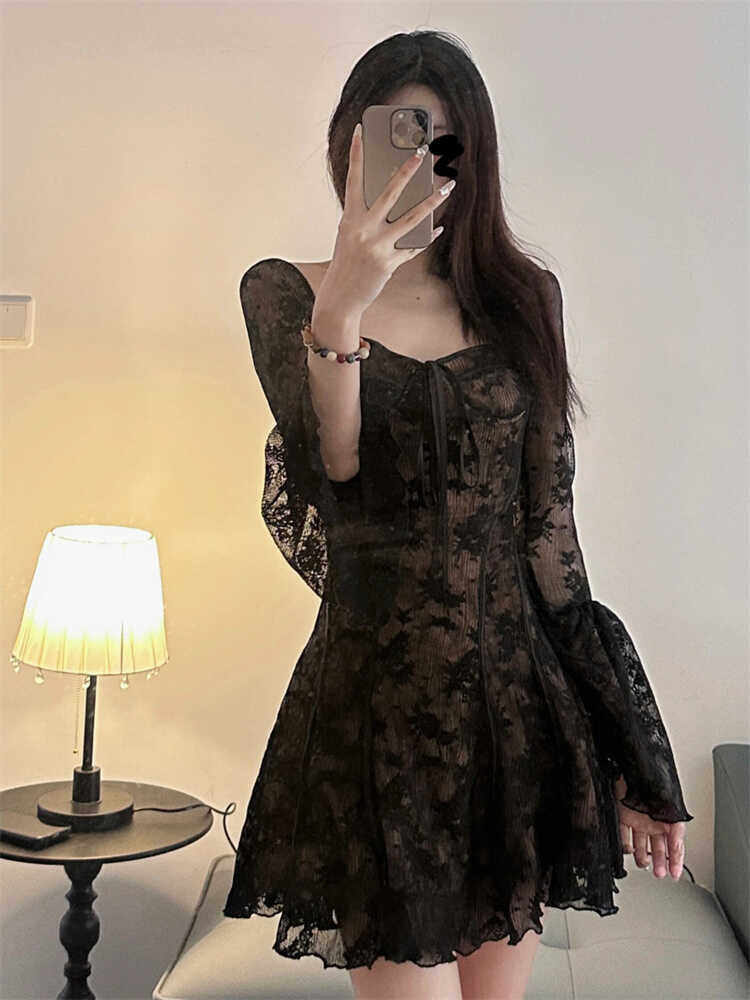 小众设计感收腰显瘦短裙子 连衣裙女新款 微胖大码 黑色蕾丝方领长袖