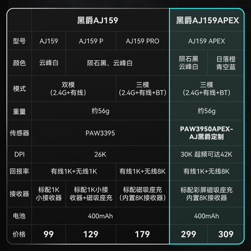 黑爵aj159apex电竞游戏鼠标PAW3950无线8K轻量化三模中小手带座充