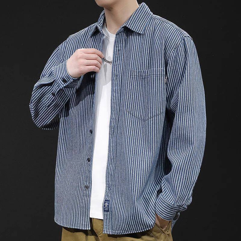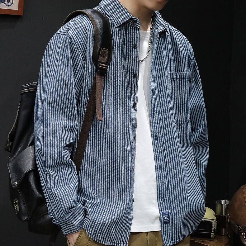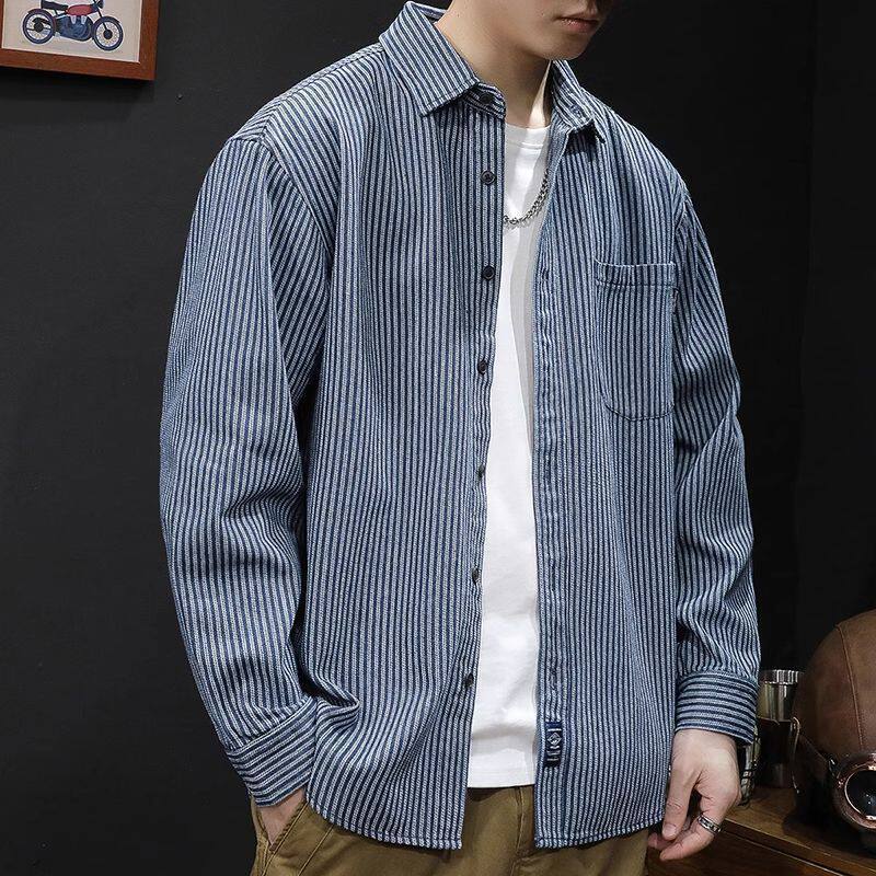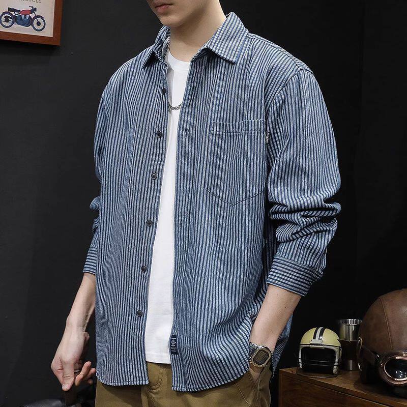 2023新款 男春秋款 条纹衬衣外套男士 休闲上衣百搭牛仔衬衫 长袖 男装