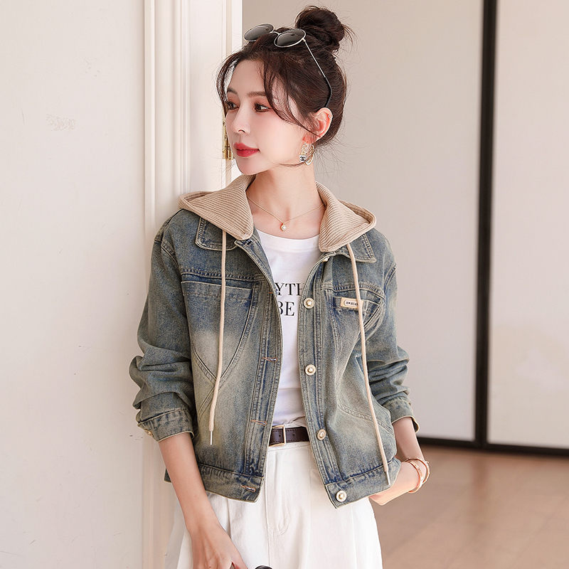 港风牛仔外套女撞色短款 宽松显瘦洋气减龄连帽夹克 上衣2025春新款