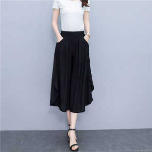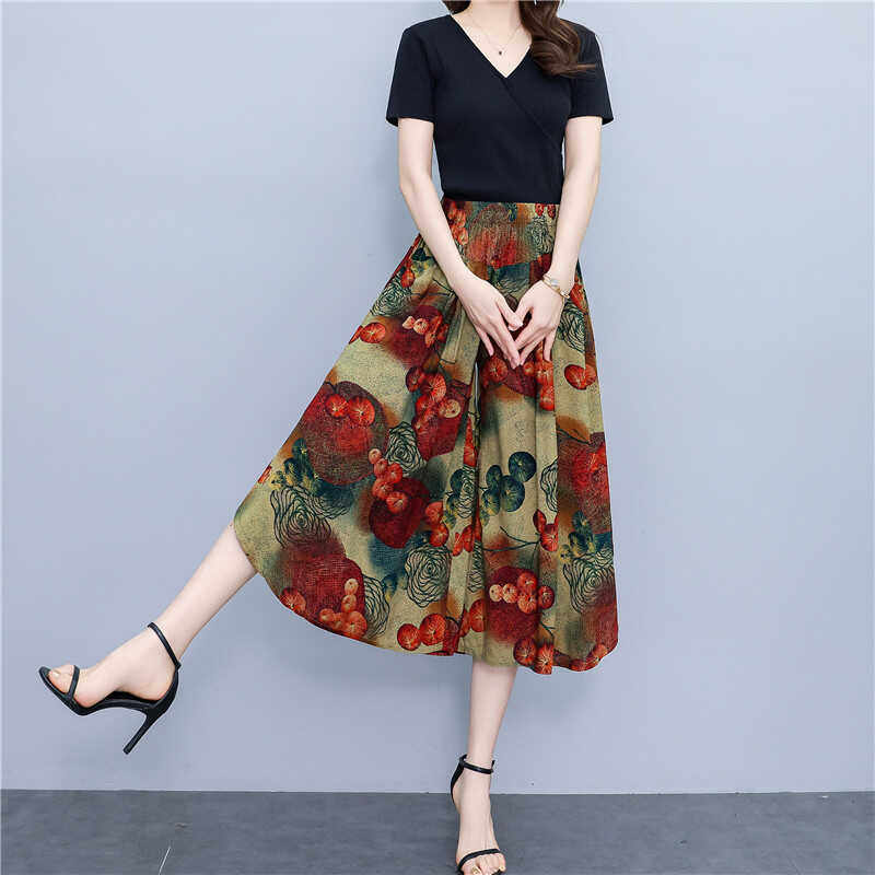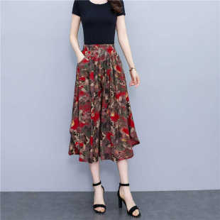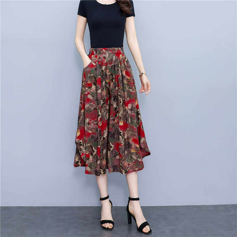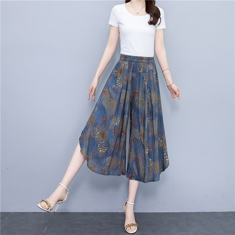 松紧腰阔腿裤 波西米亚大摆碎花七分裙裤 显瘦棉绸高腰薄款 新款 夏季