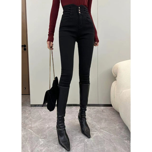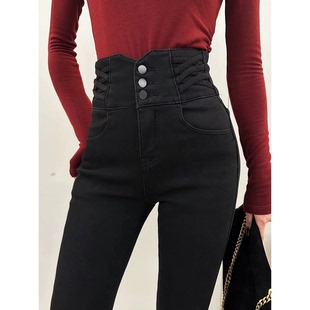 加绒小脚牛仔裤 纪金其黑色百搭时尚 九分高腰小脚裤 限时福利款