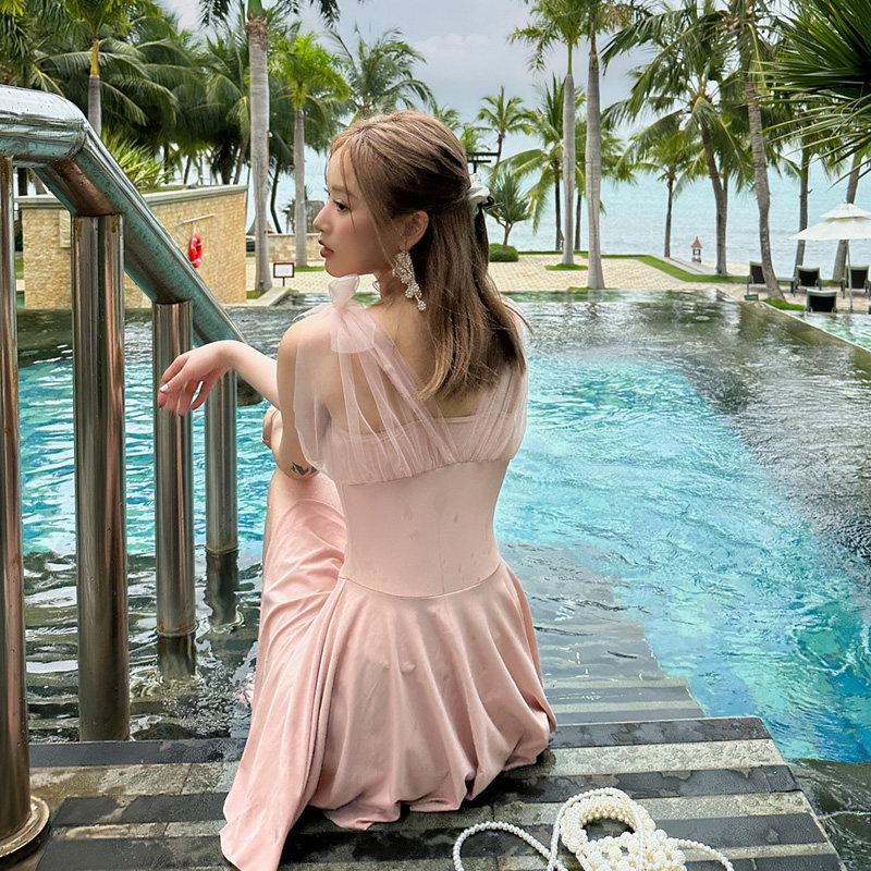 泡温泉泳装 泳衣女款 高级感性感吊带小胸聚拢保守遮肚显瘦连体裙式