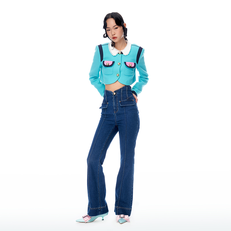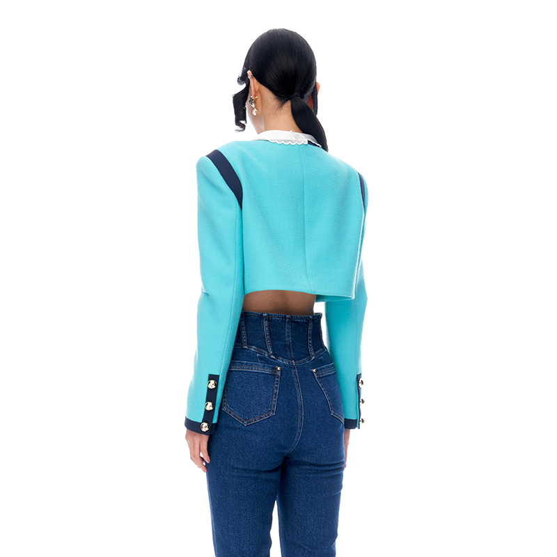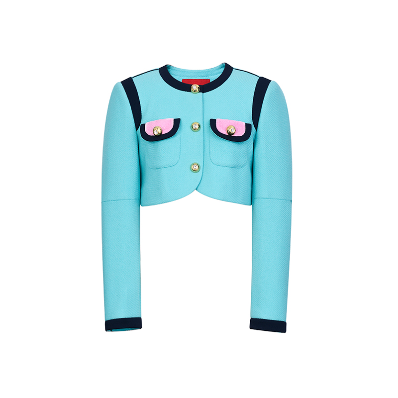 lefame拉飞姆羊毛格子料水蓝色俏皮撞色短外套 张雨绮同款