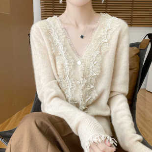 长袖 25秋冬100%纯羊毛开衫 女V领蕾丝流苏毛衣外套宽松钩花羊绒衫