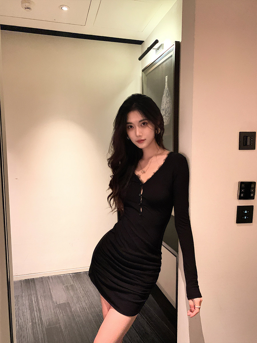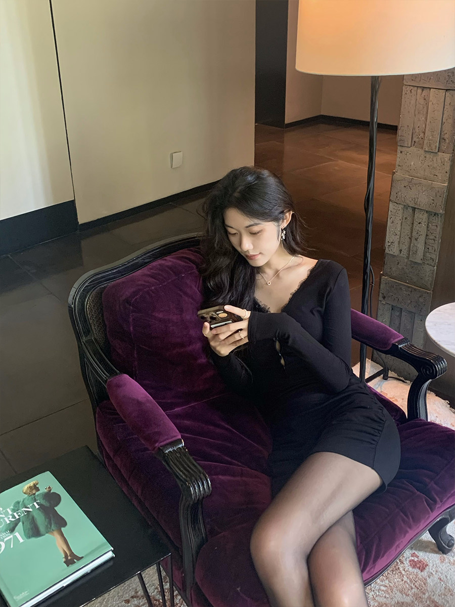 短款 Norain不下雨 修身 包臀连衣裙女冬季 打底裙 洋气蕾丝拼接长袖