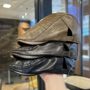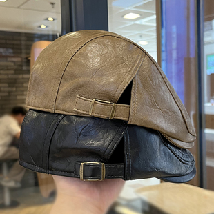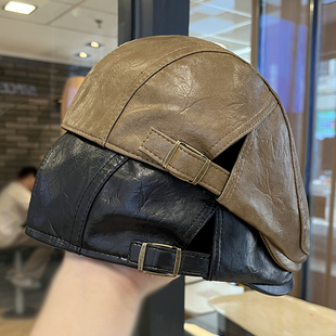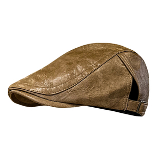 时尚 简约纯色pu皮前进帽子女春秋季 百搭显脸小气质画家帽 新款 韩版