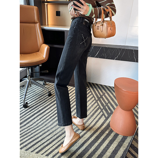 重工满天星加绒阔腿直筒裤 加厚新款 女2025冬季 黑色闪钻提花牛仔裤