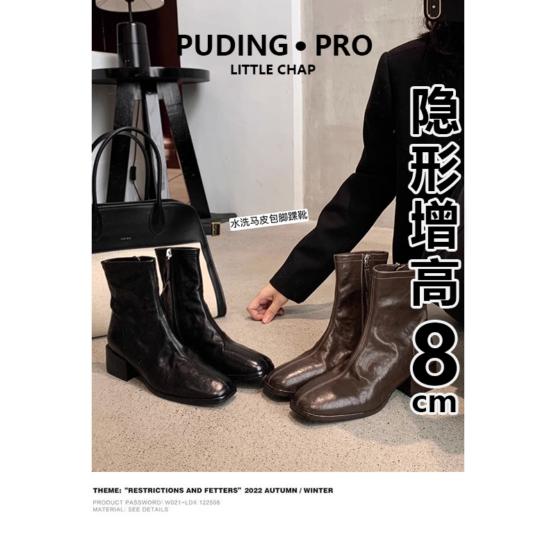 牛皮版 内增高方头粗跟短靴女靴子马丁靴小个子短筒瘦瘦靴小踝靴
