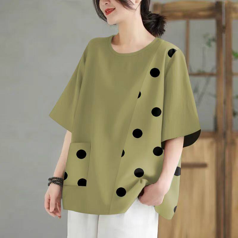圆领短袖 百搭宽松显瘦上衣女大码 口袋t恤衫 时尚 印花韩版 2025夏季