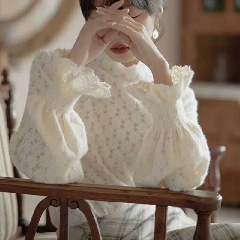 衬衫 套头上衣宽松长袖 春 女内搭秋冬洋气泡泡袖 百搭磨毛打底蕾丝衫