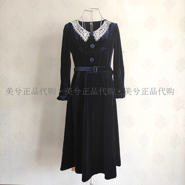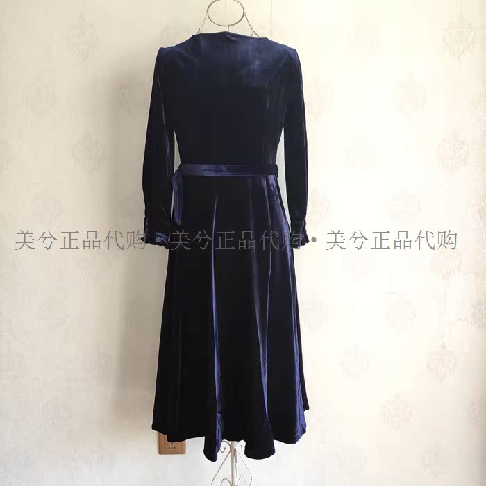 2020秋新款 长裙6016 连衣裙蓝色复古收腰大摆金丝绒蕾丝长袖