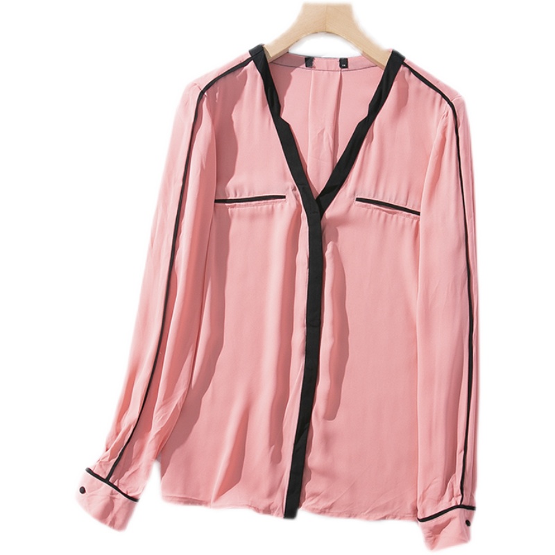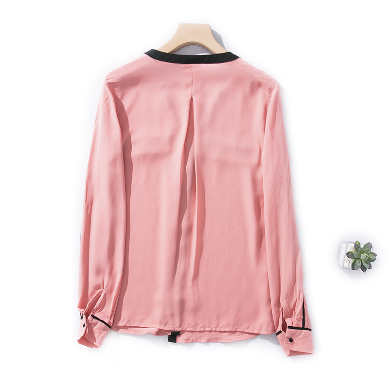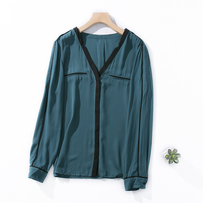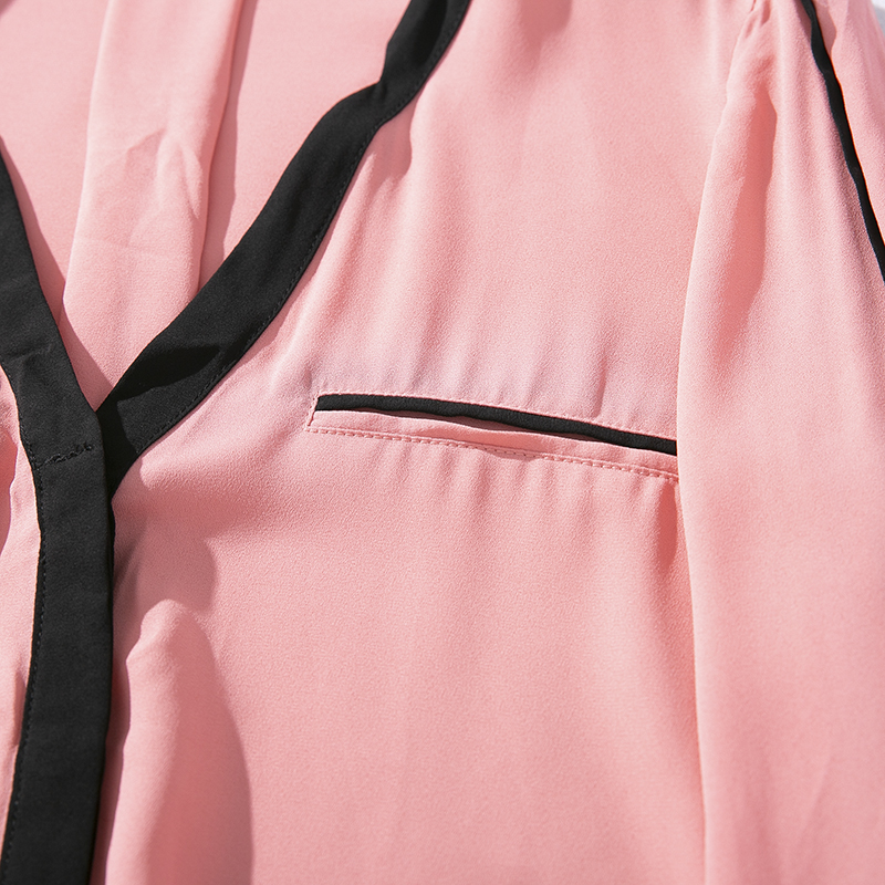 4夏季 衬衫 初秋女外贸V领单排扣撞色边垂感气质雪纺衫 长袖 时尚 E69