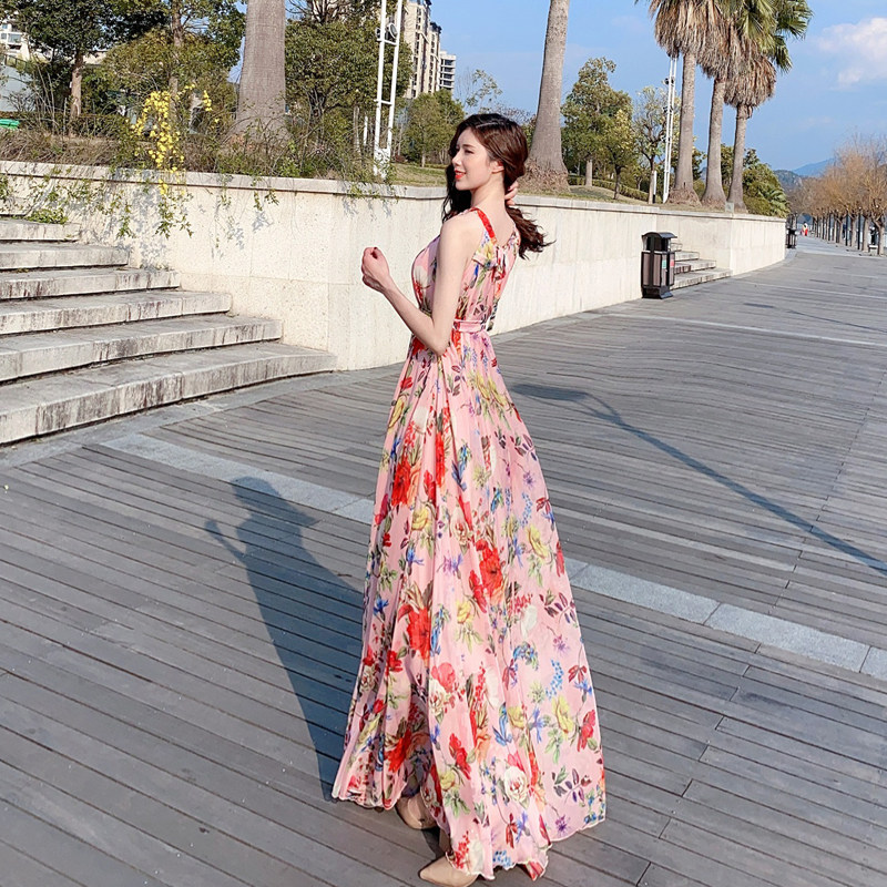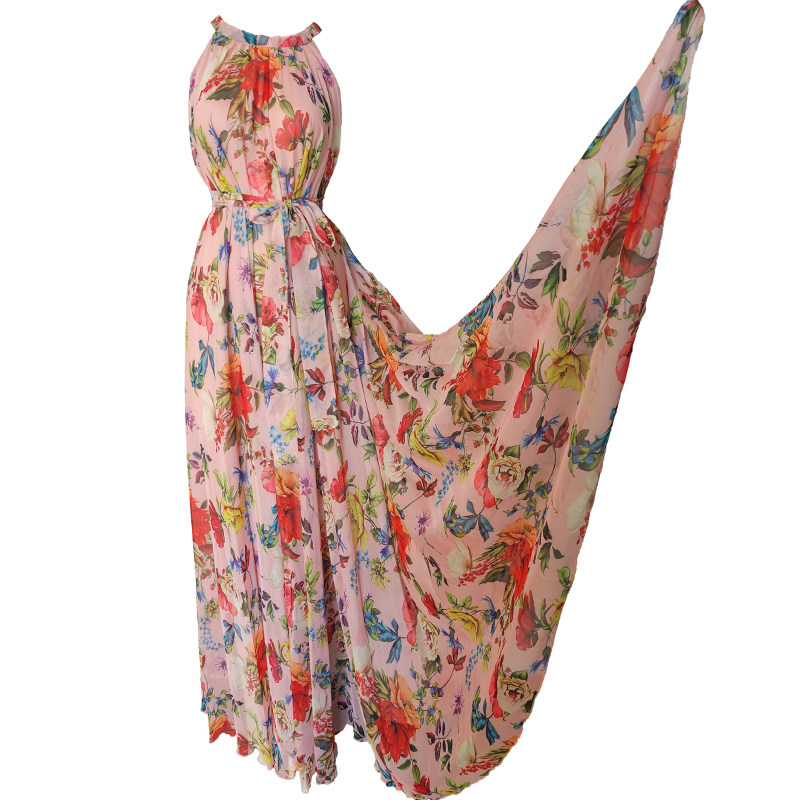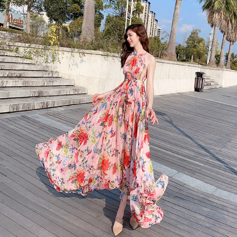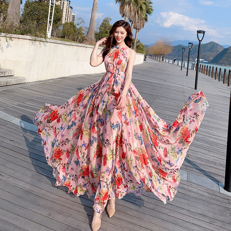 雪纺连衣裙大码 及踝大摆印花吊带裙波西米亚度假沙滩裙挂脖长裙夏