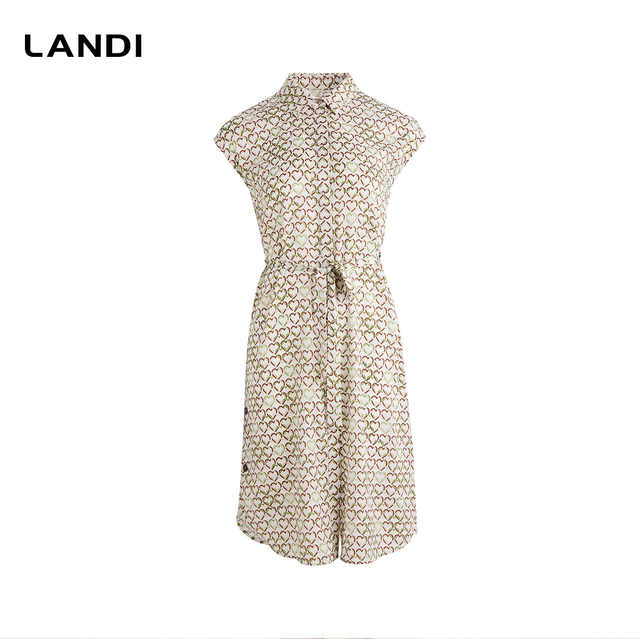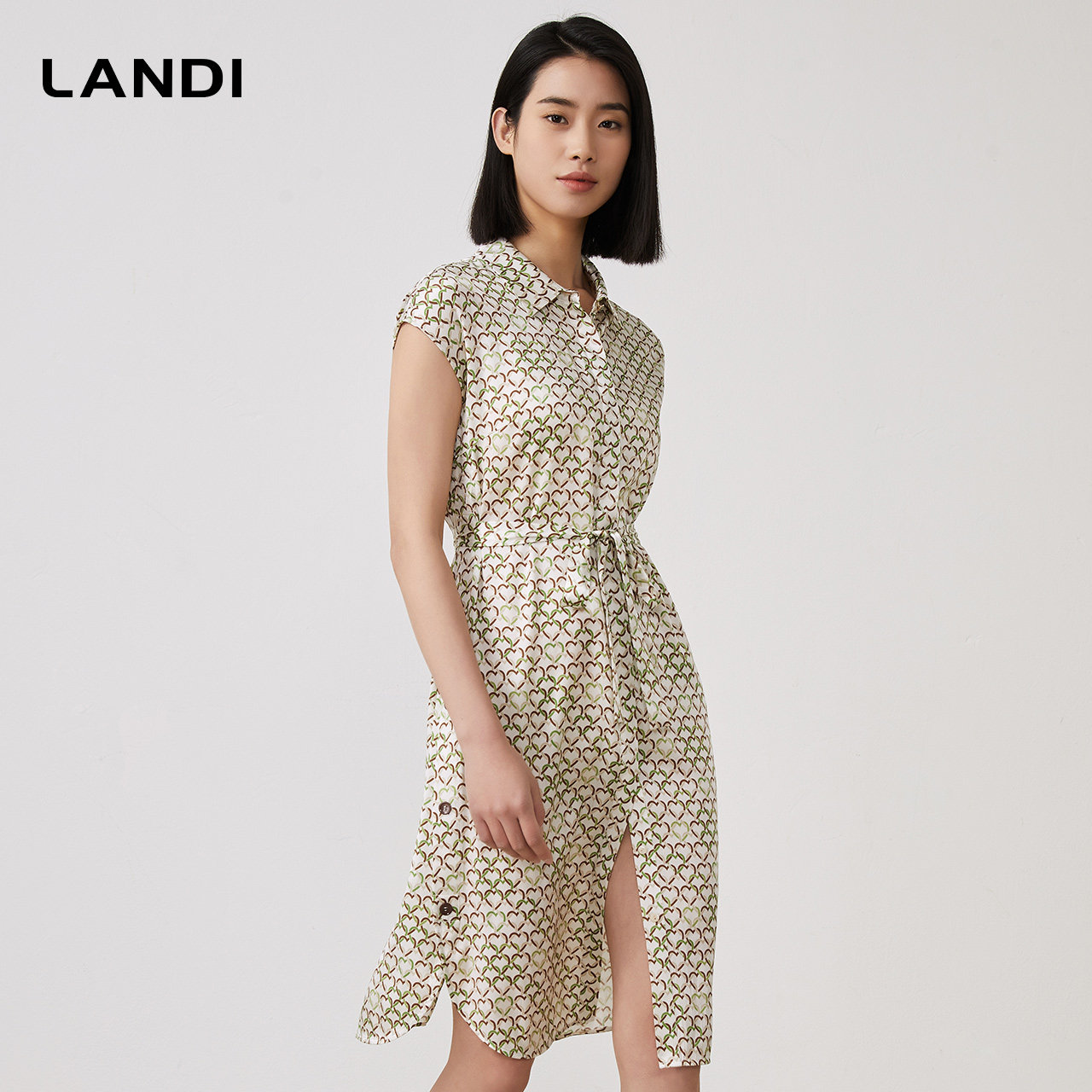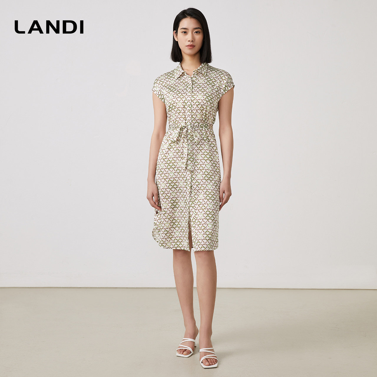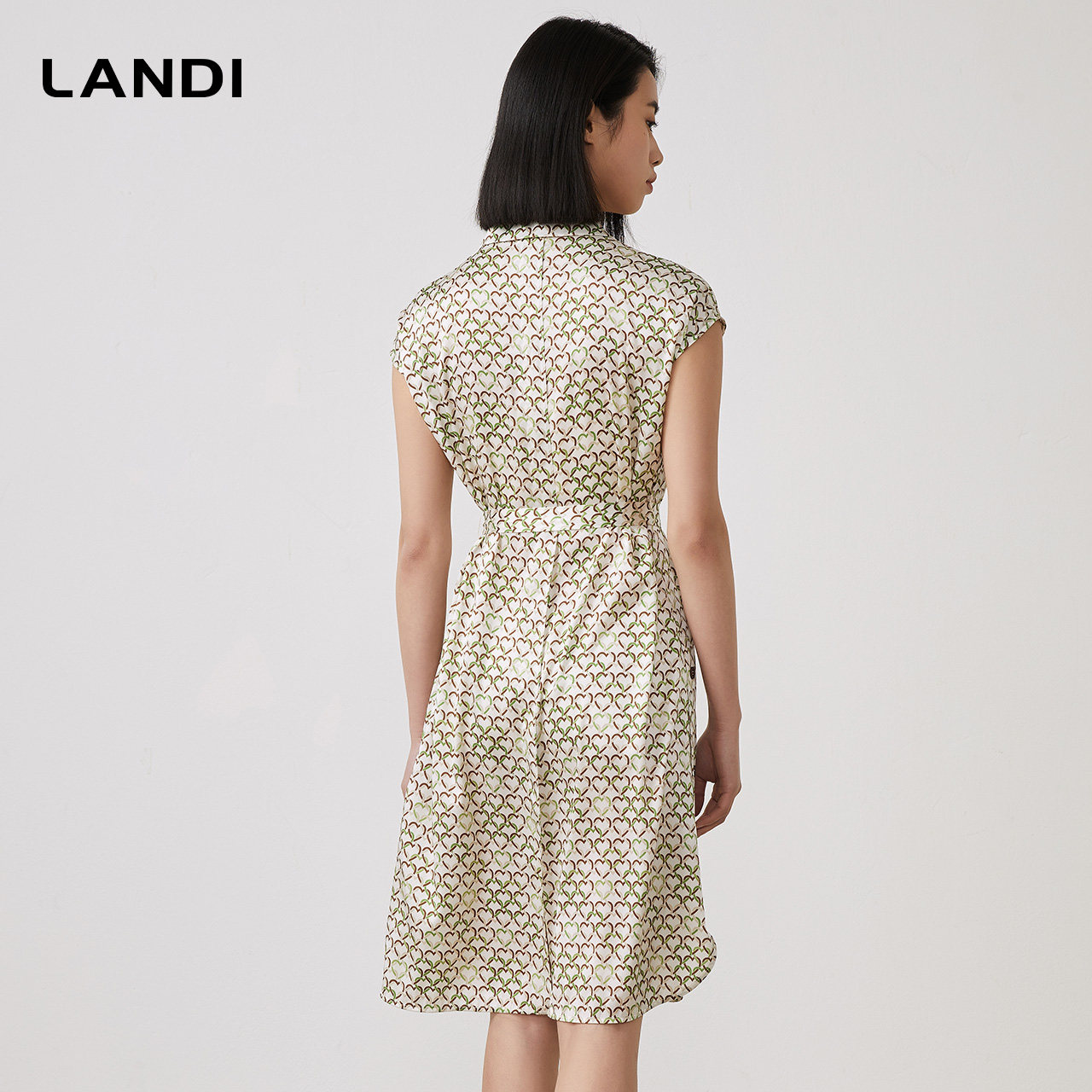 LANDI翻领浅绿色真丝包袖 桃心印花桑蚕丝连衣裙女夏新品