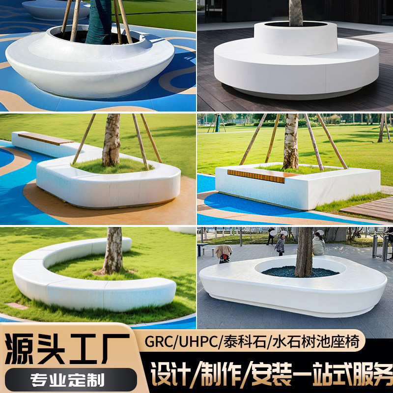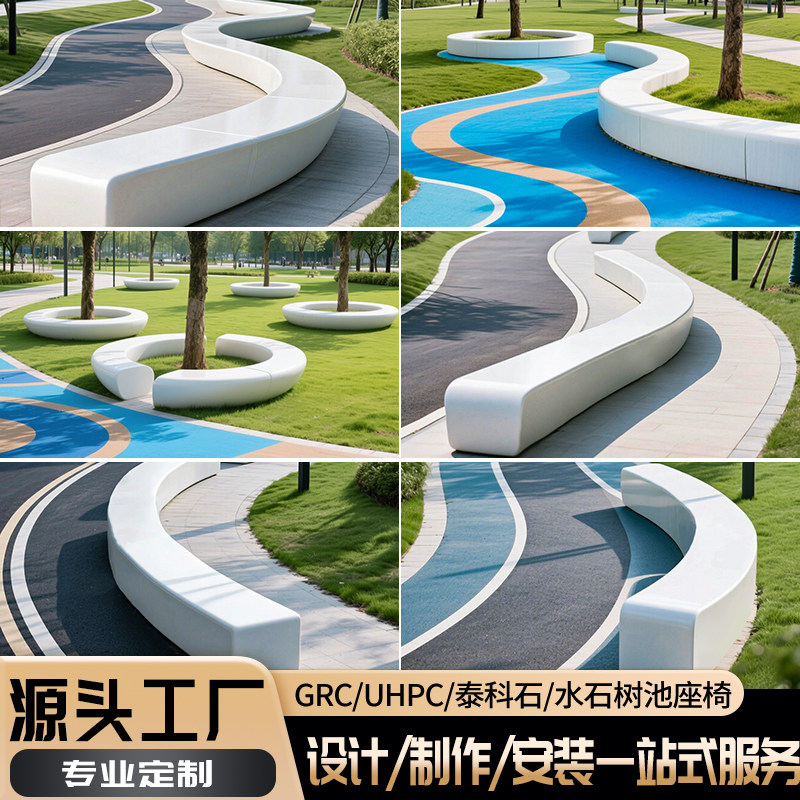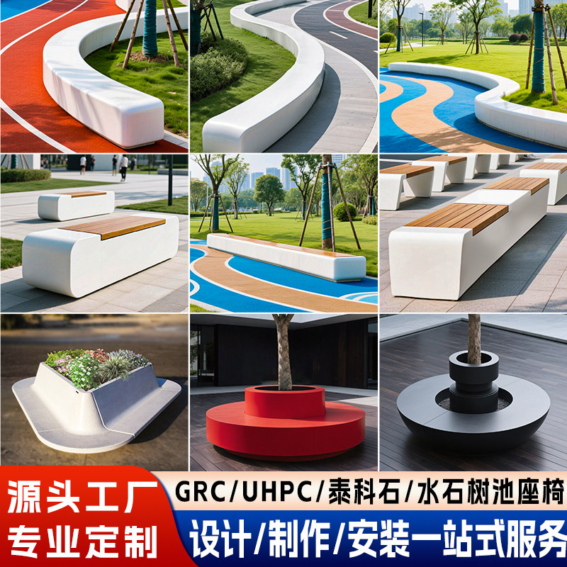 户外GRC座椅水磨石泰科石坐凳定制UHPC混凝土长树池玻璃钢休闲椅