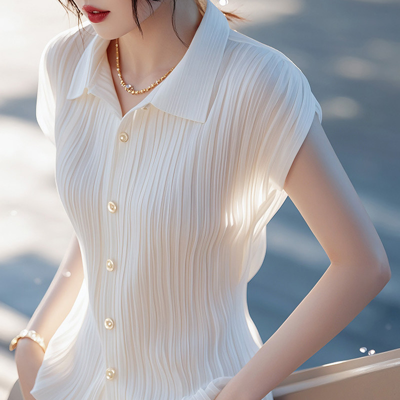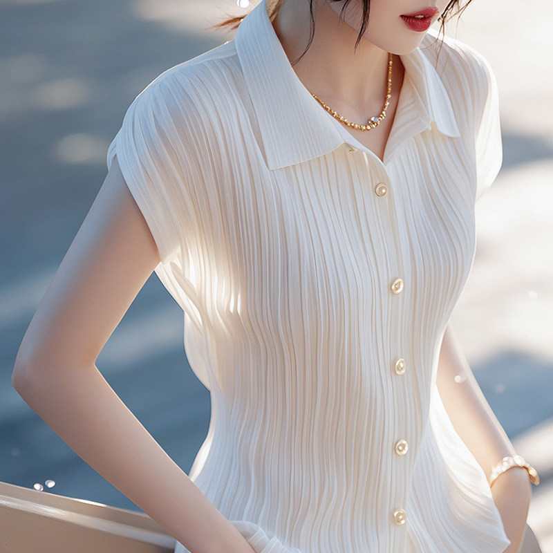 款 女夏季 高级感条纹独特桑蚕丝轻奢简约百搭上衣 衬衫 真丝白色短袖