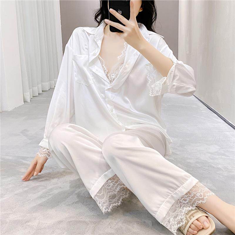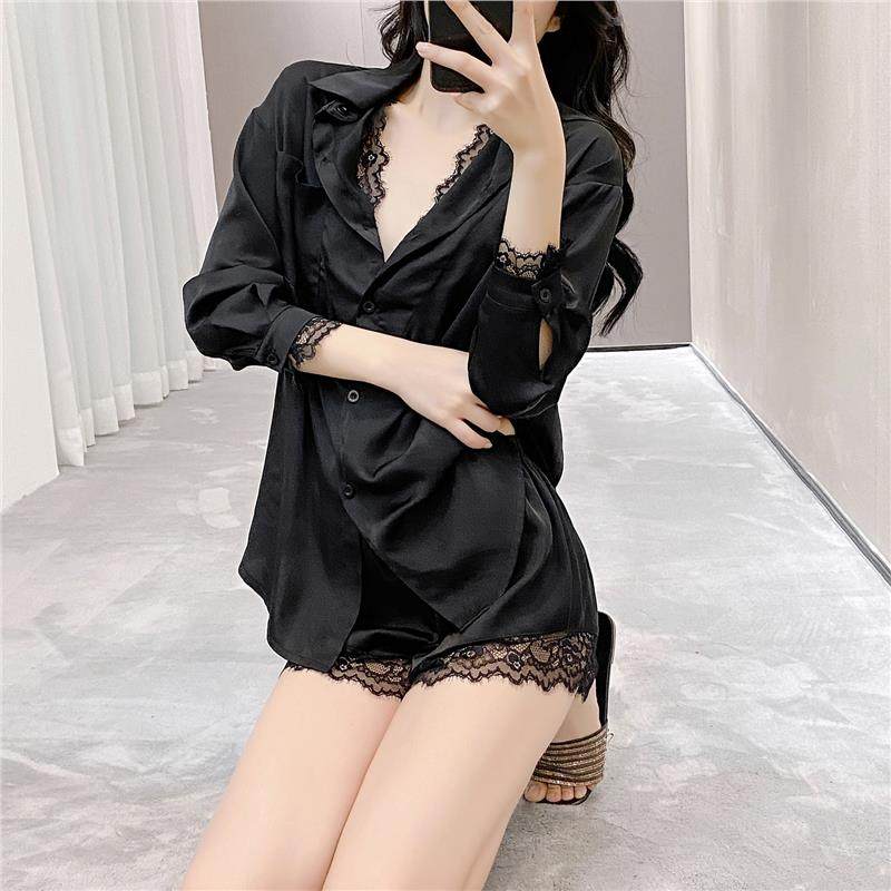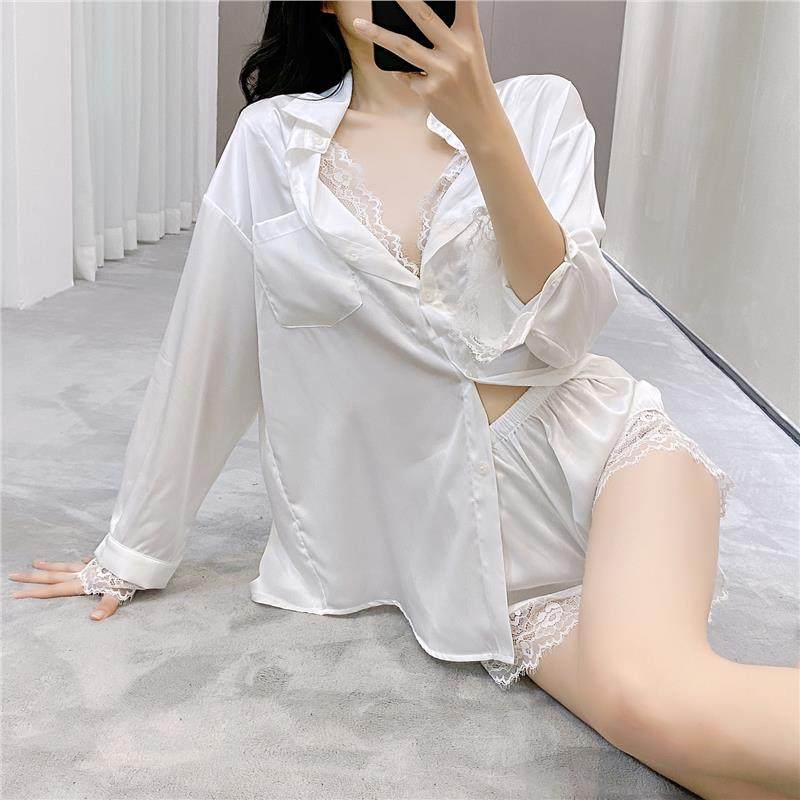 裙短裤 睡衣女款 宽松白衬衫 性感冰丝睡衣女纯欲风蕾丝长袖 2025新款