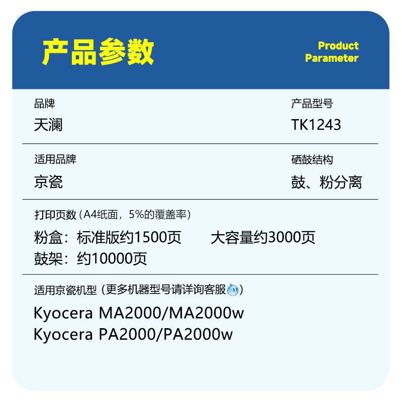 天澜适用京瓷MA2000W粉盒PA2000W PA2000硒鼓TK1243碳粉黑白激光打印机墨盒DK1243成像鼓鼓架墨盒 MA2000