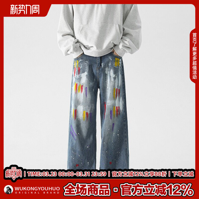 悟空有货潮牌设计感泼墨涂鸦宽松直筒牛仔裤 男嘻哈街头休闲阔腿裤
