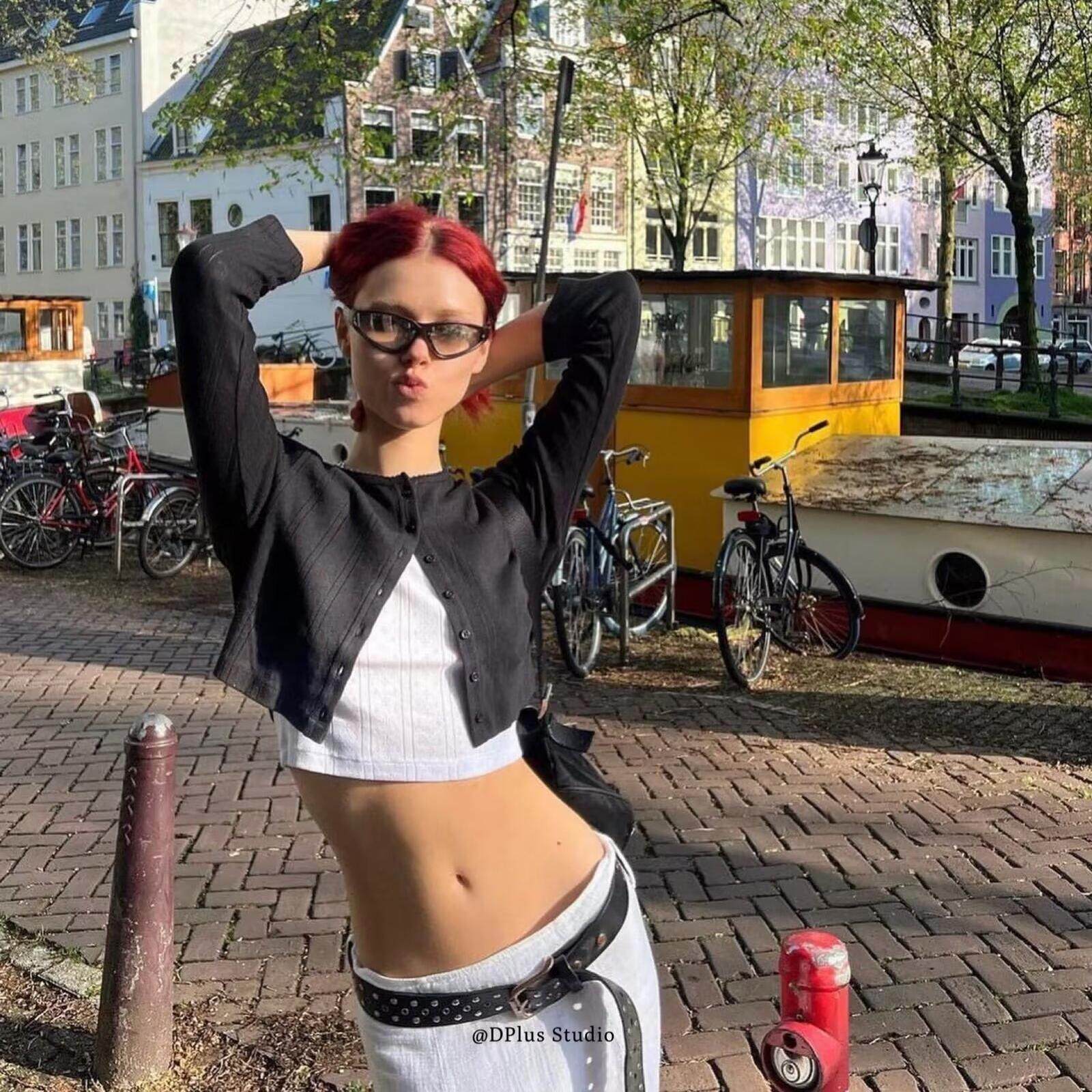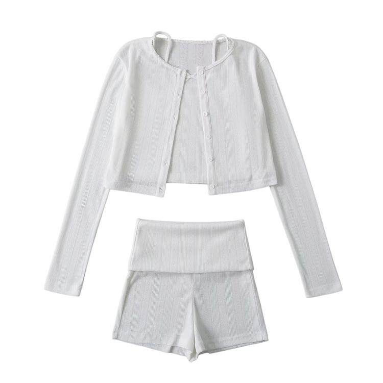 套装 辣妹小圆领高腰纯色薄长袖 吊带翻腰短裤 短外套修身 女 针织开衫