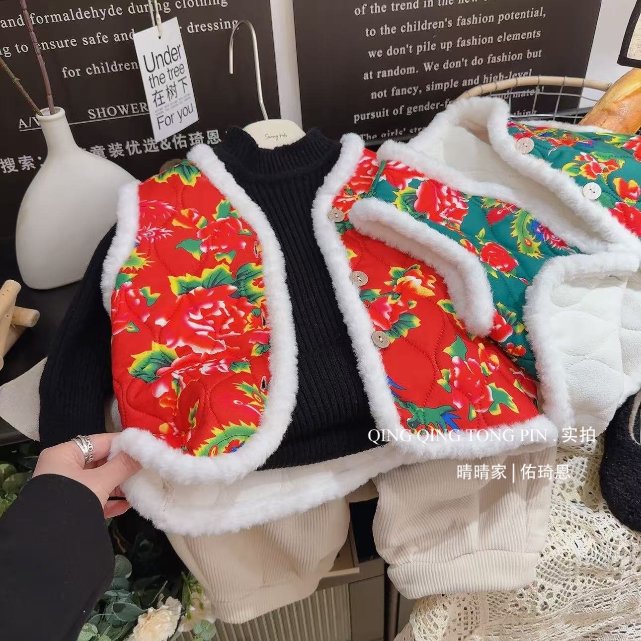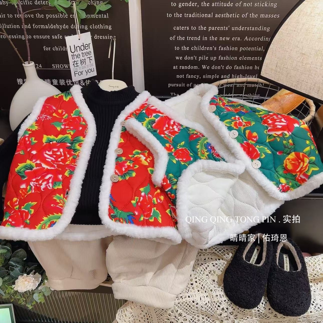 儿童棉马甲秋冬三层加绒加厚印花保暖背心中国风宝宝拜年服大花