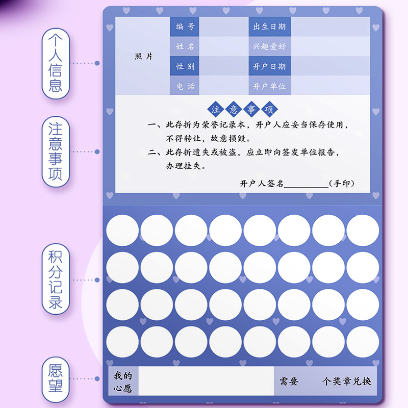 儿童心愿存折小学生积分卡印章盖章收集本幼儿园贴纸孩子奖励学习记录卡集赞集星星小红花家用打卡阅读存折
